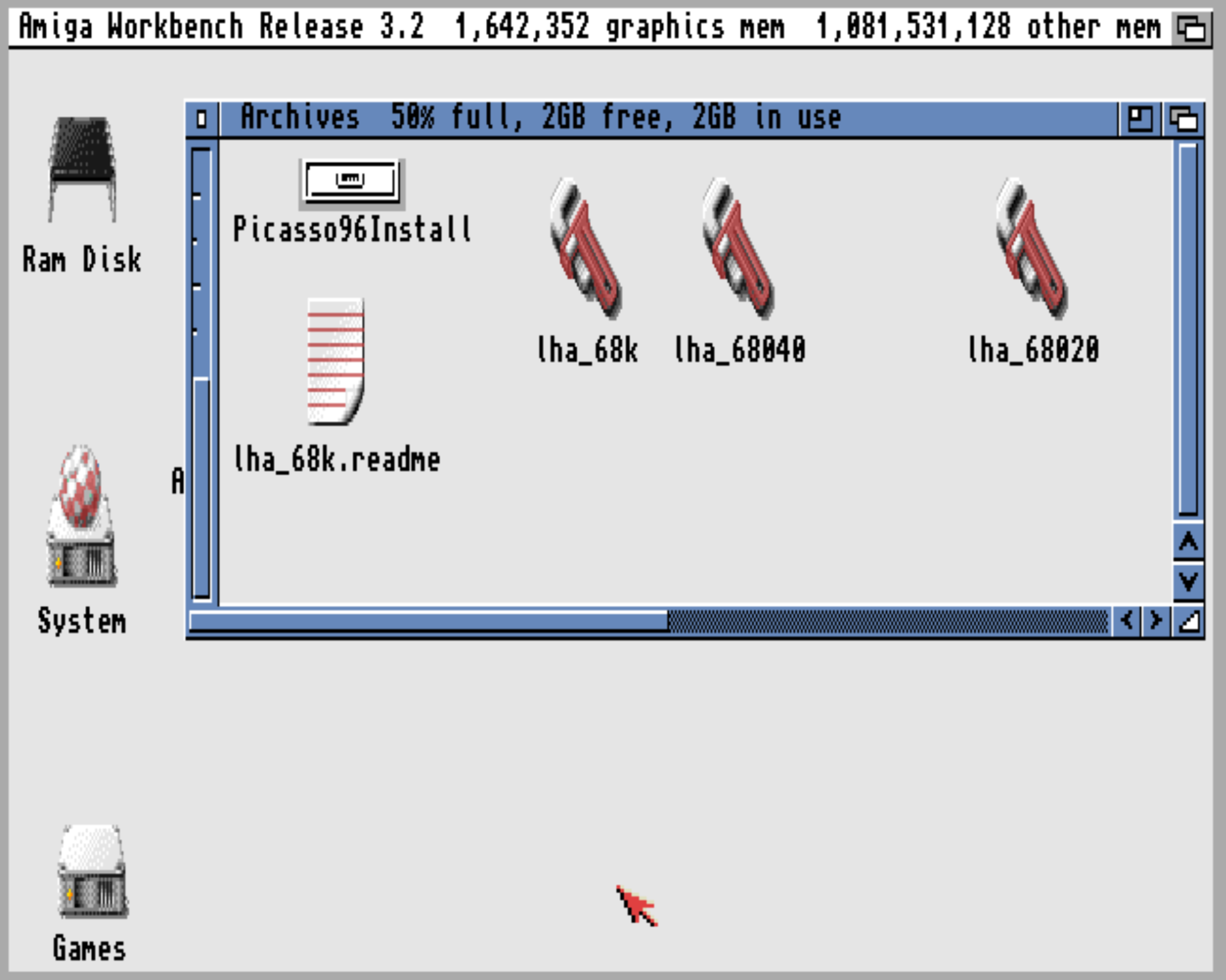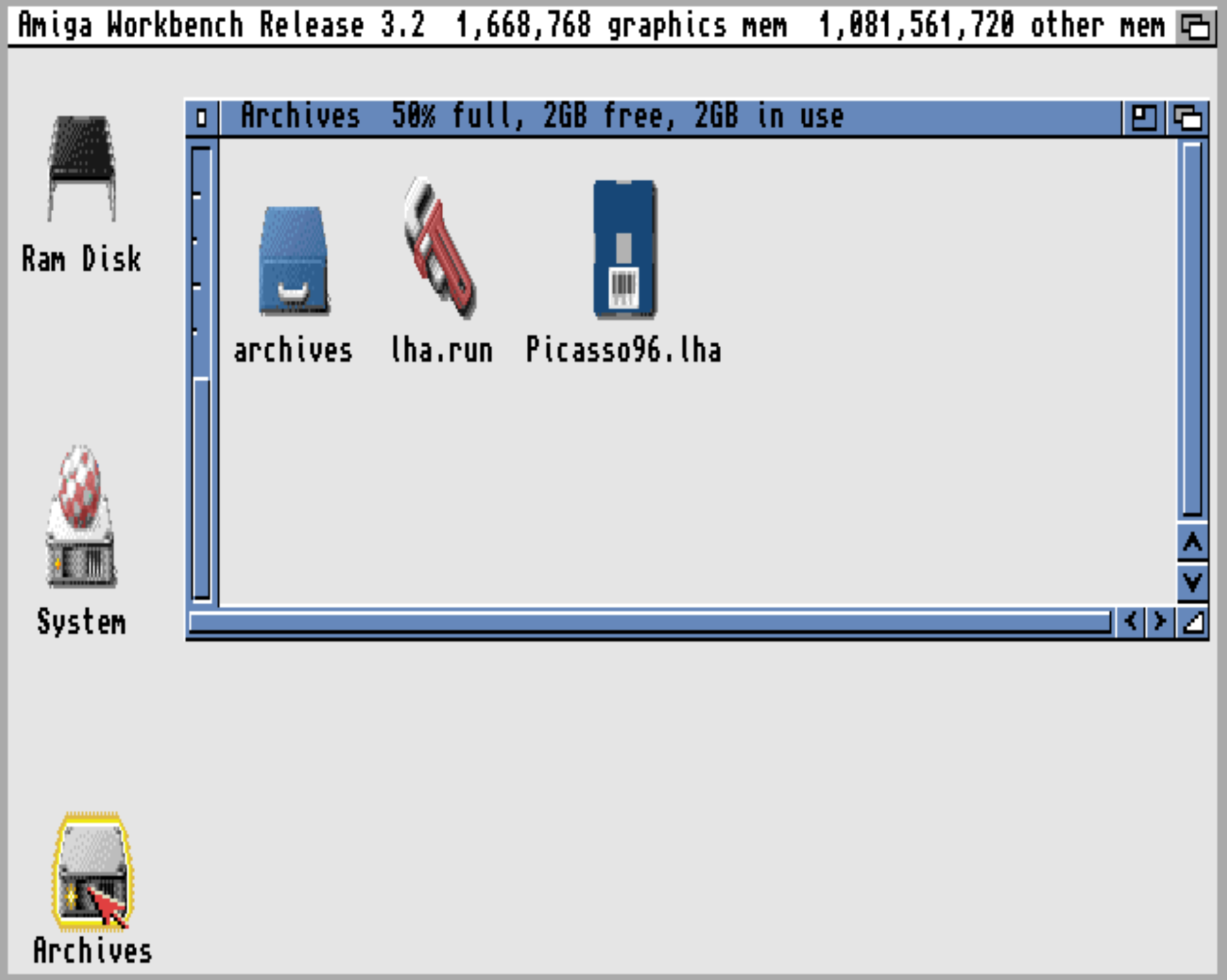 Once Picasso96 and lha are downloaded, copy them to the directory used as the storage for the Archives drive mentioned above. This will make them available within the emulated OS. Open the Archives drive on the Amiga and you will see the two archives.