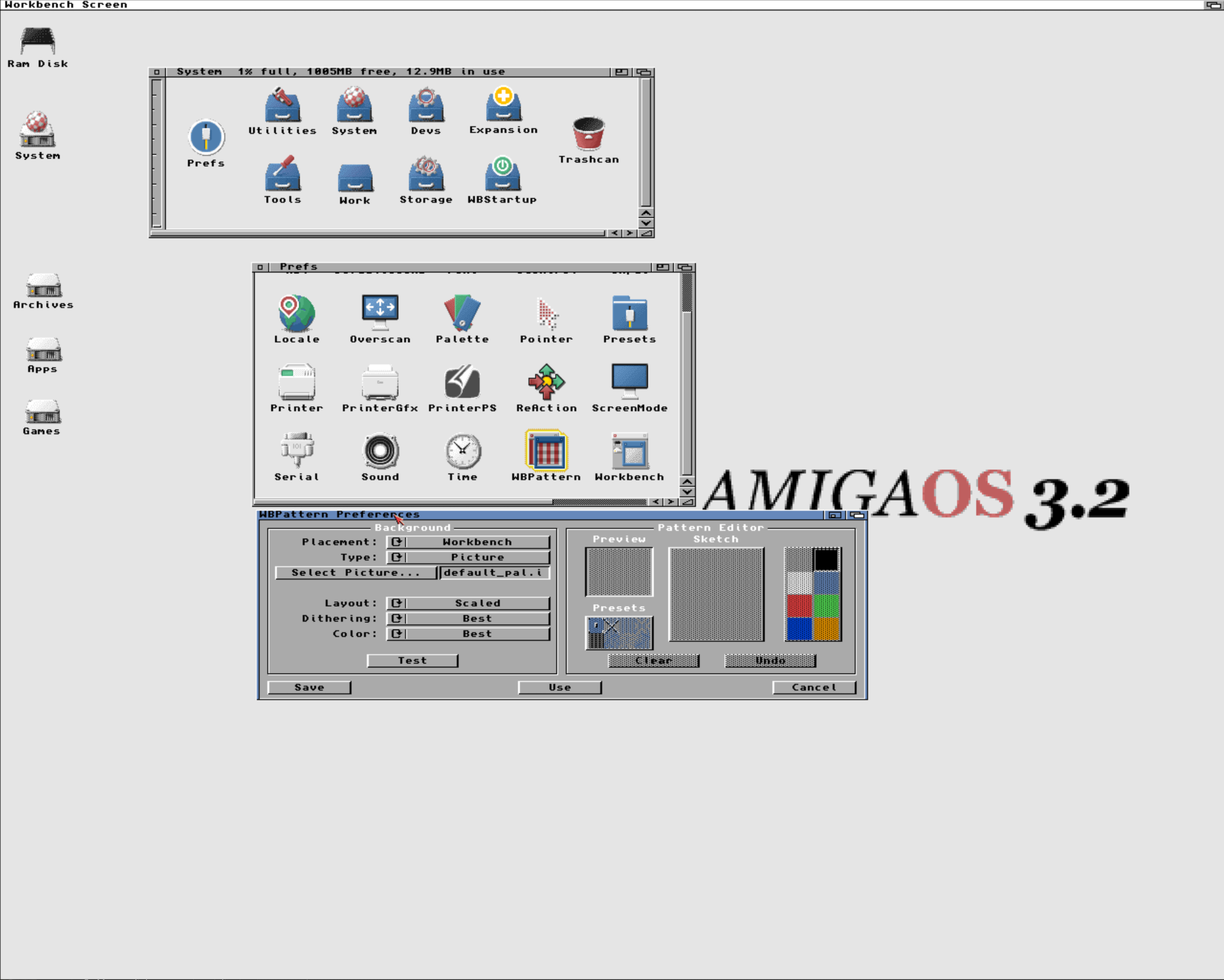 But notice the background picture doesn’t look the best in this new resolution. Lets fix that. Open Prefs again from the System Drive and launch the WB Pattern tool.