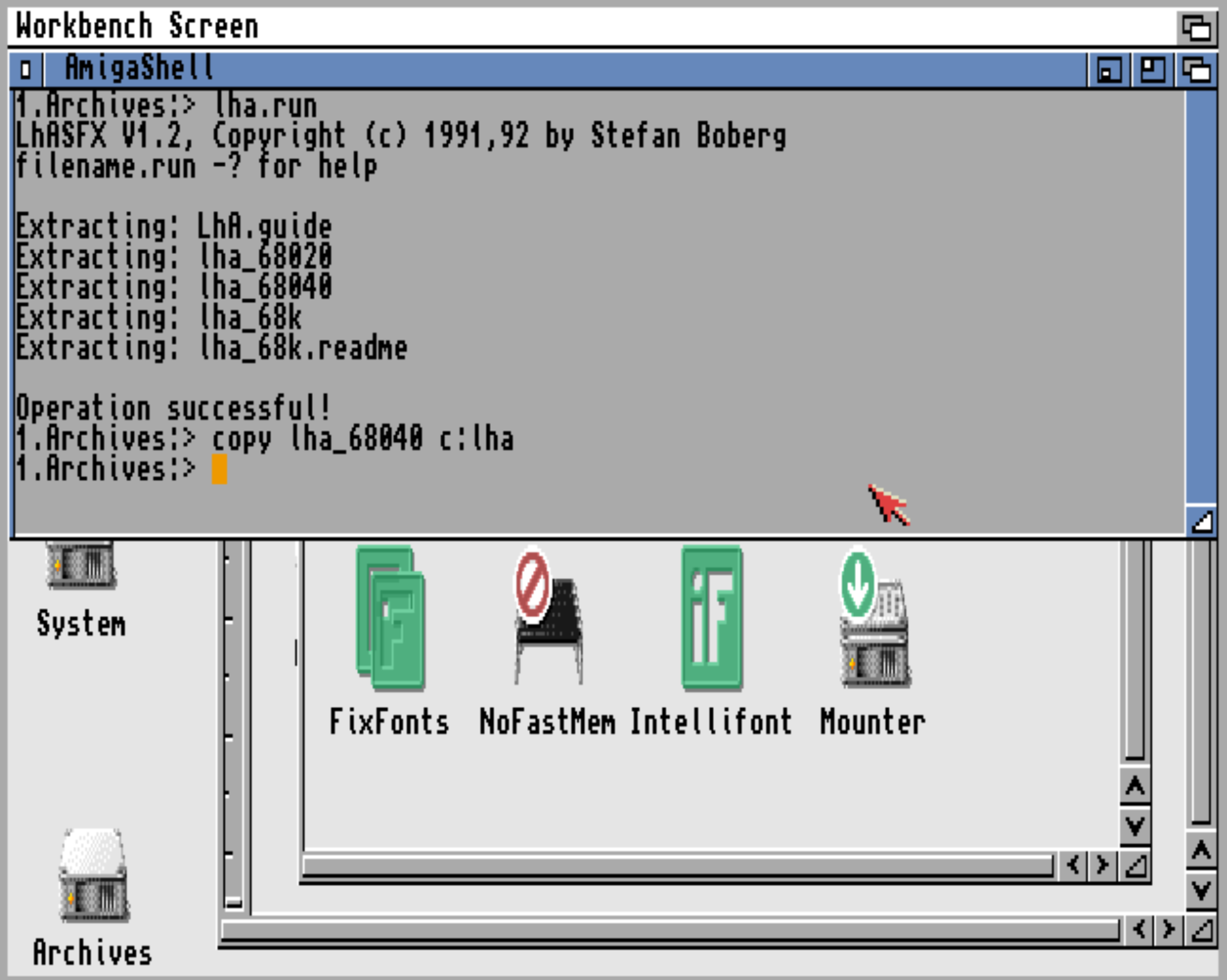Next run the lha.run program. This extracts the self extracting lha archive which contains processor optimised versions of the lha utility. This is a command line tool so next we copy it to the C: assign the default path for AmigaOS shell tools. Copying lha to C: will put in the system path meaning we can execute it from any directory. To copy the correct version run the command line: copy lha_68040 C: This will copy the tool to C: as lha.