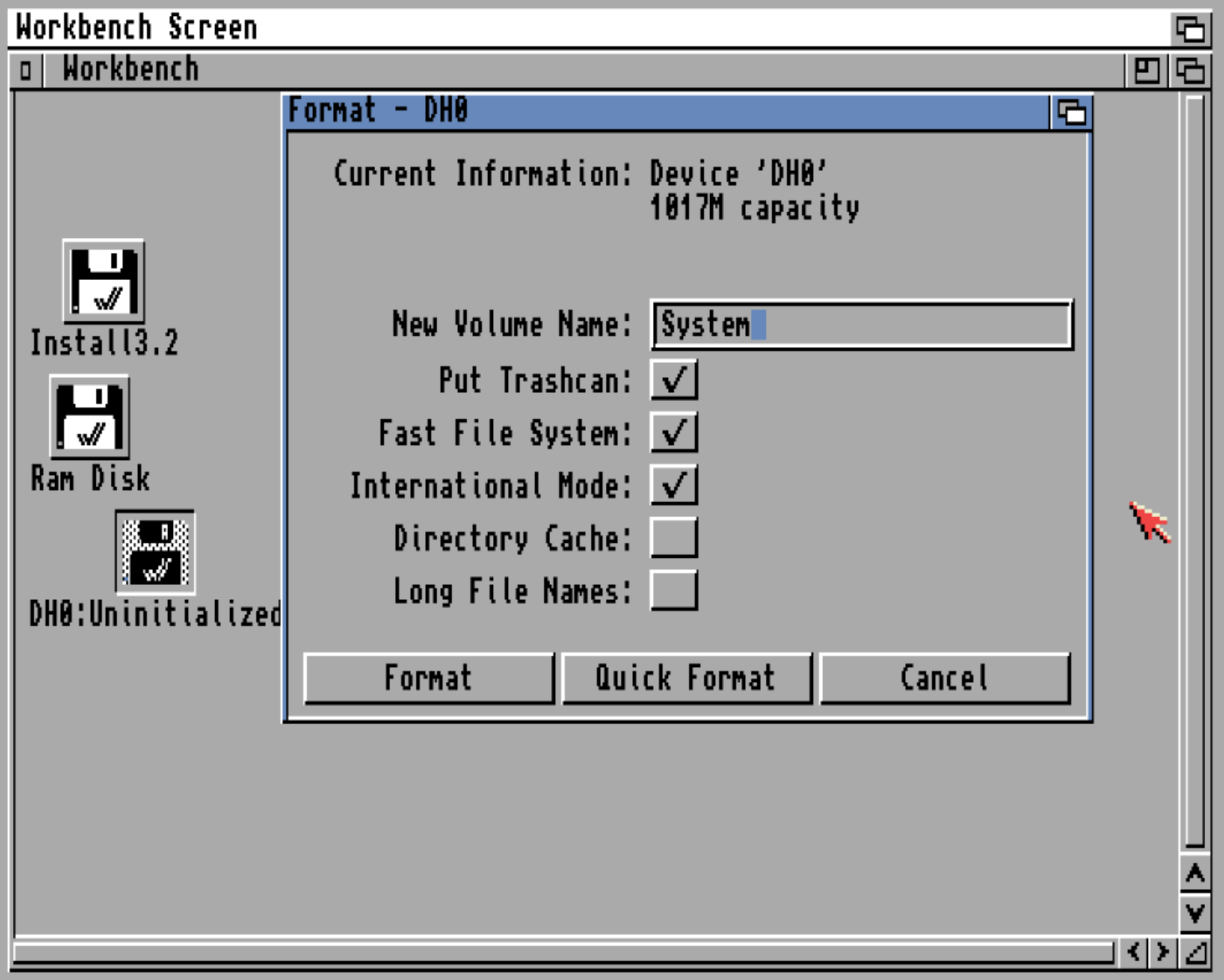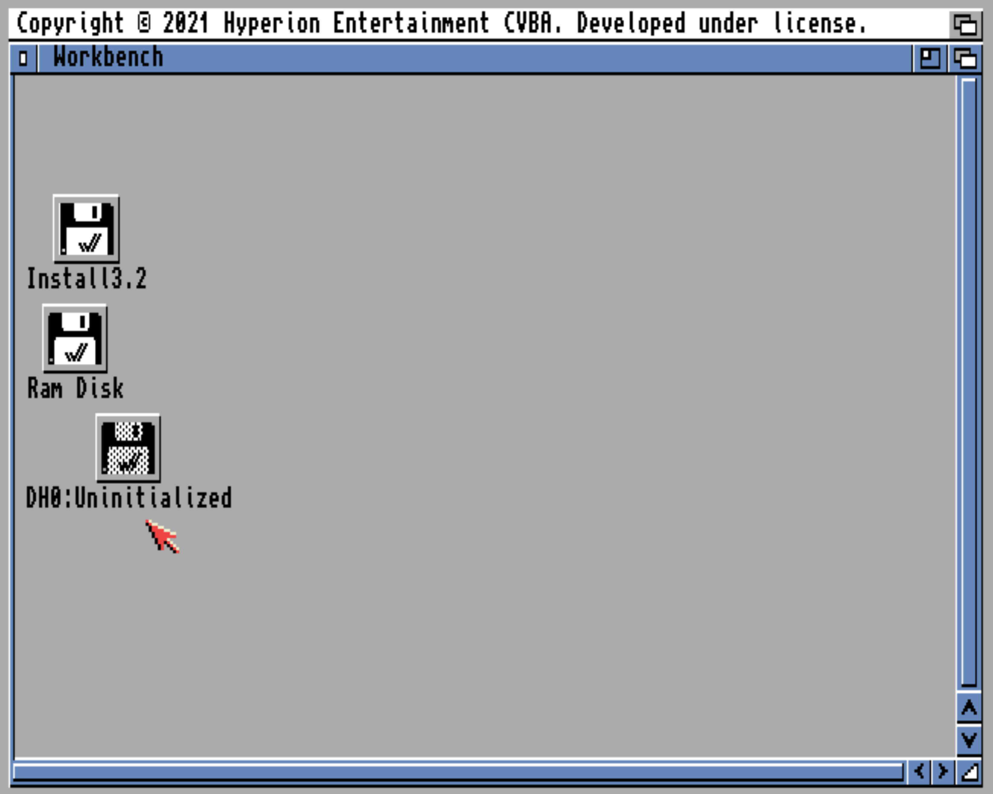 After the reboot we will see a new disk icon on the workbench screen DH0:Uninitialized