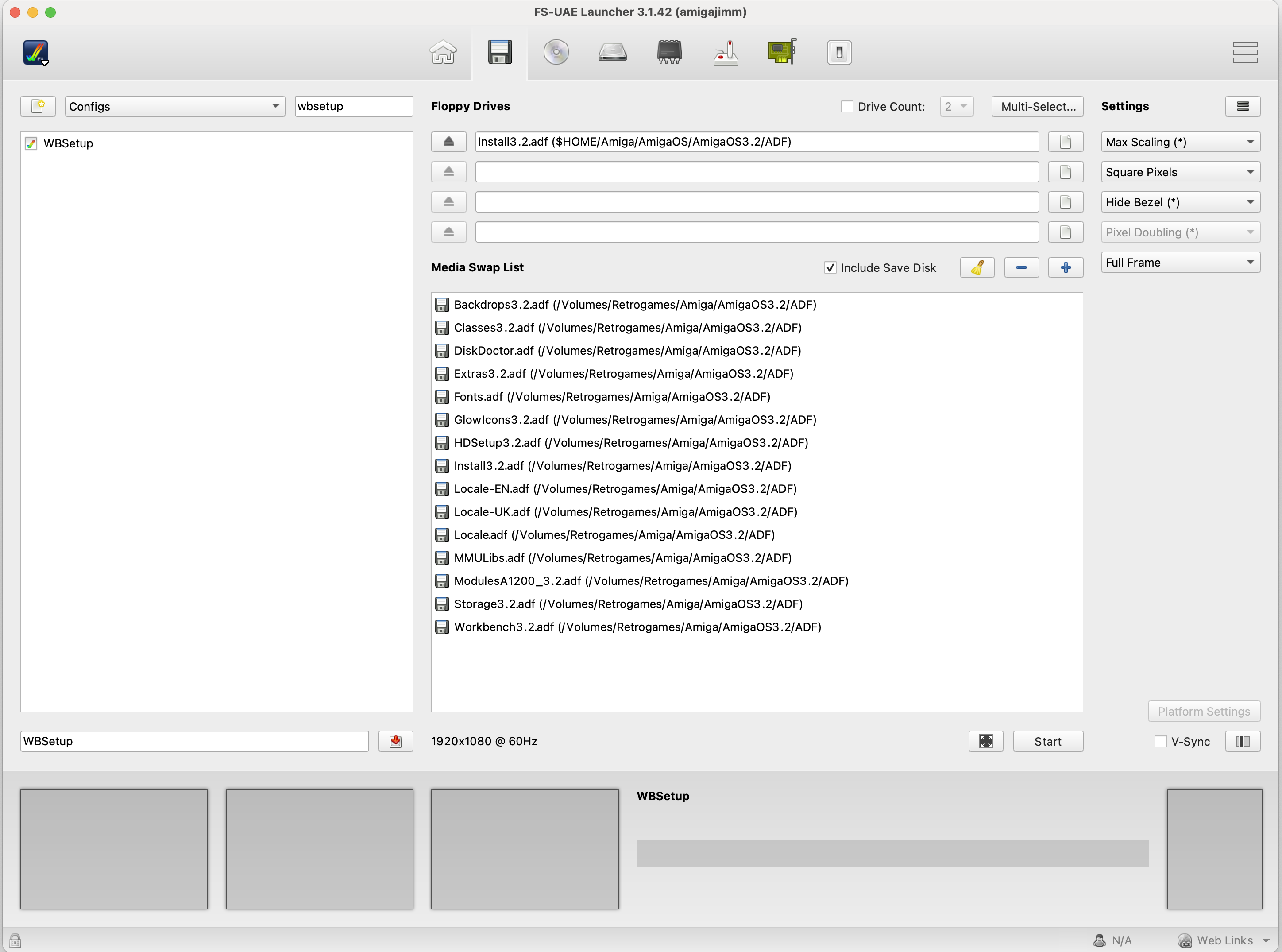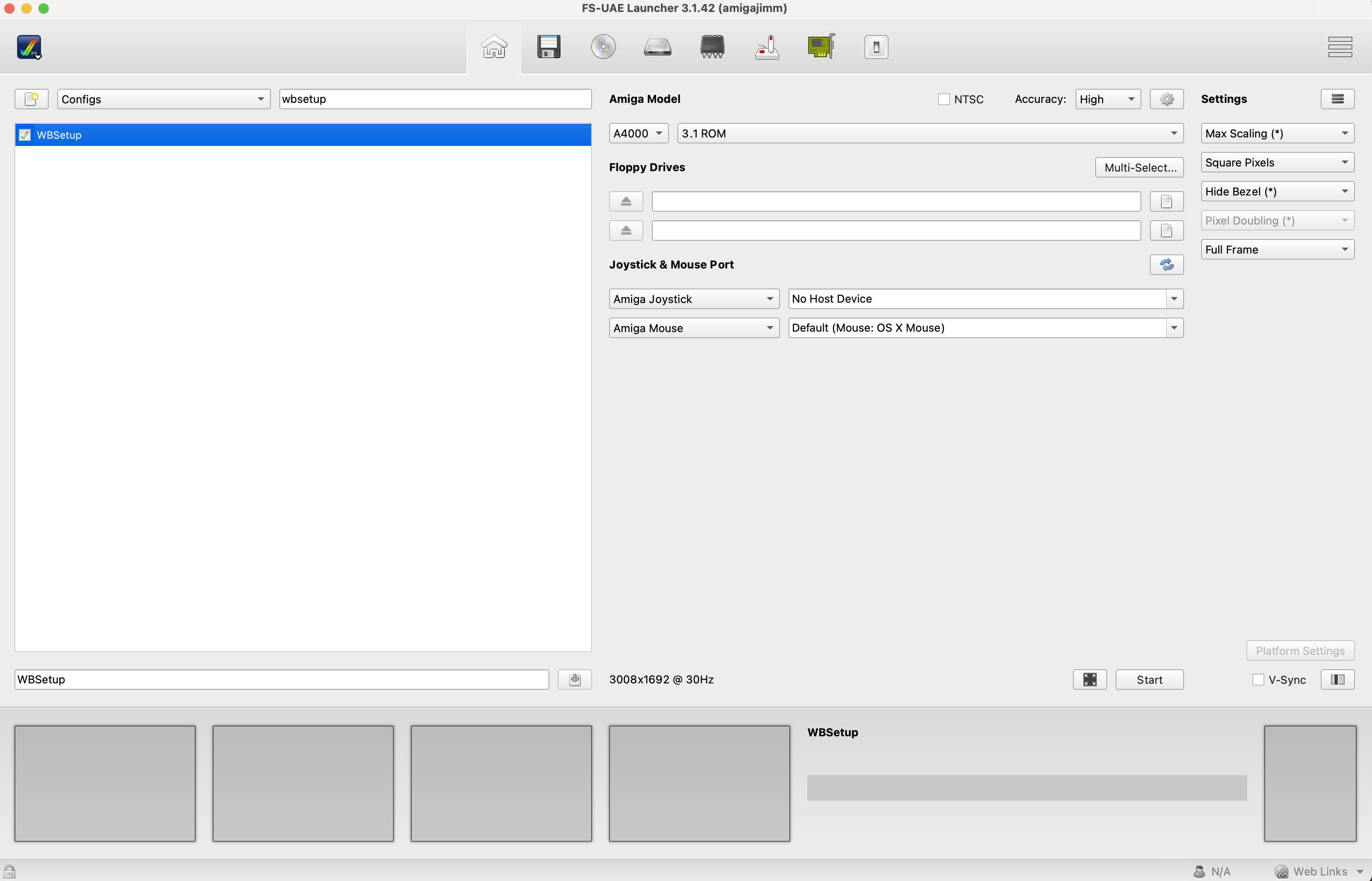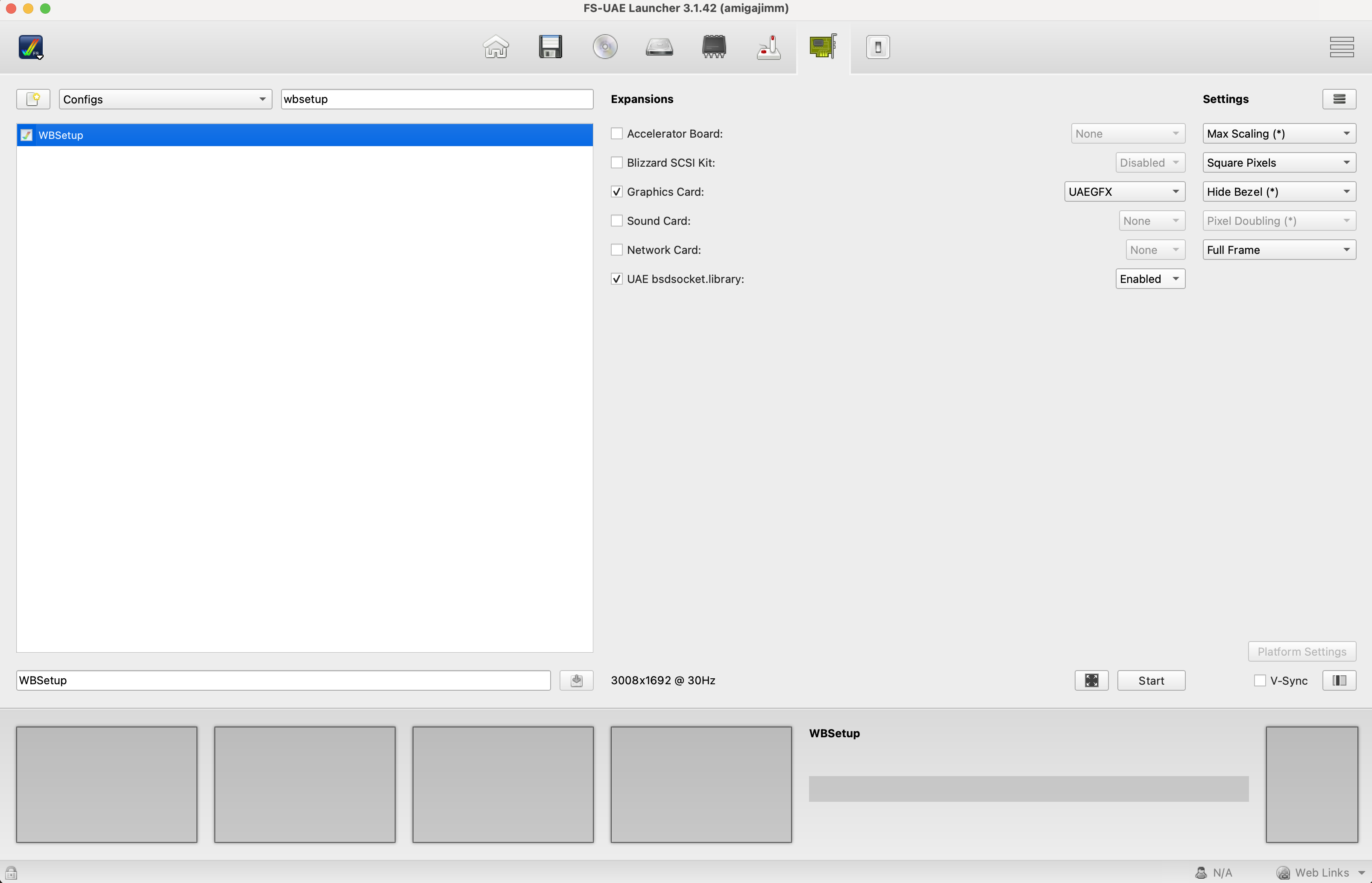 The image below shows the Home tab on the FS-UAE launcher. I choose the Amiga 4000 hardware model with the 3.1 ROM (3.2 wasn’t available natively in the version I used).