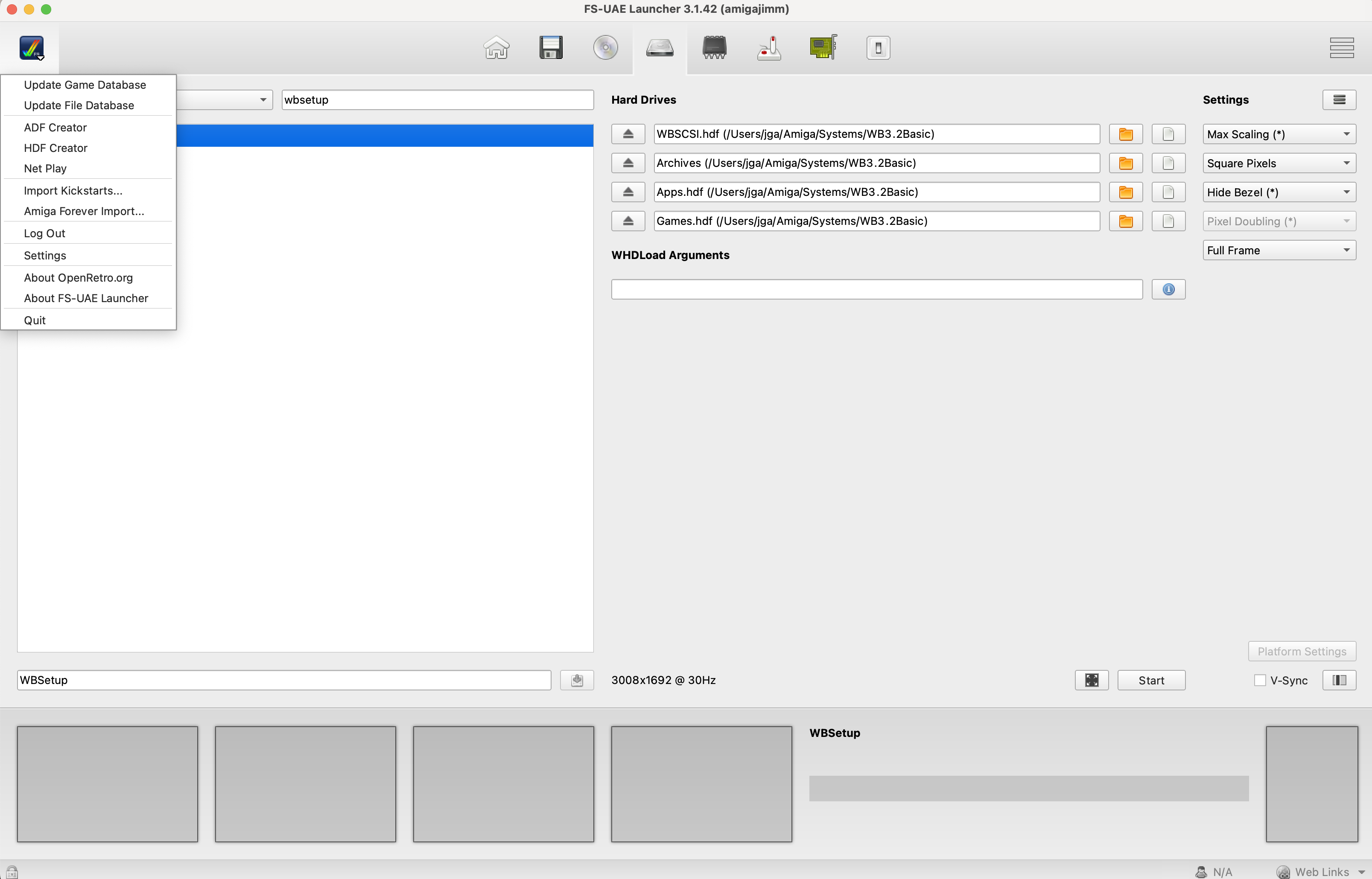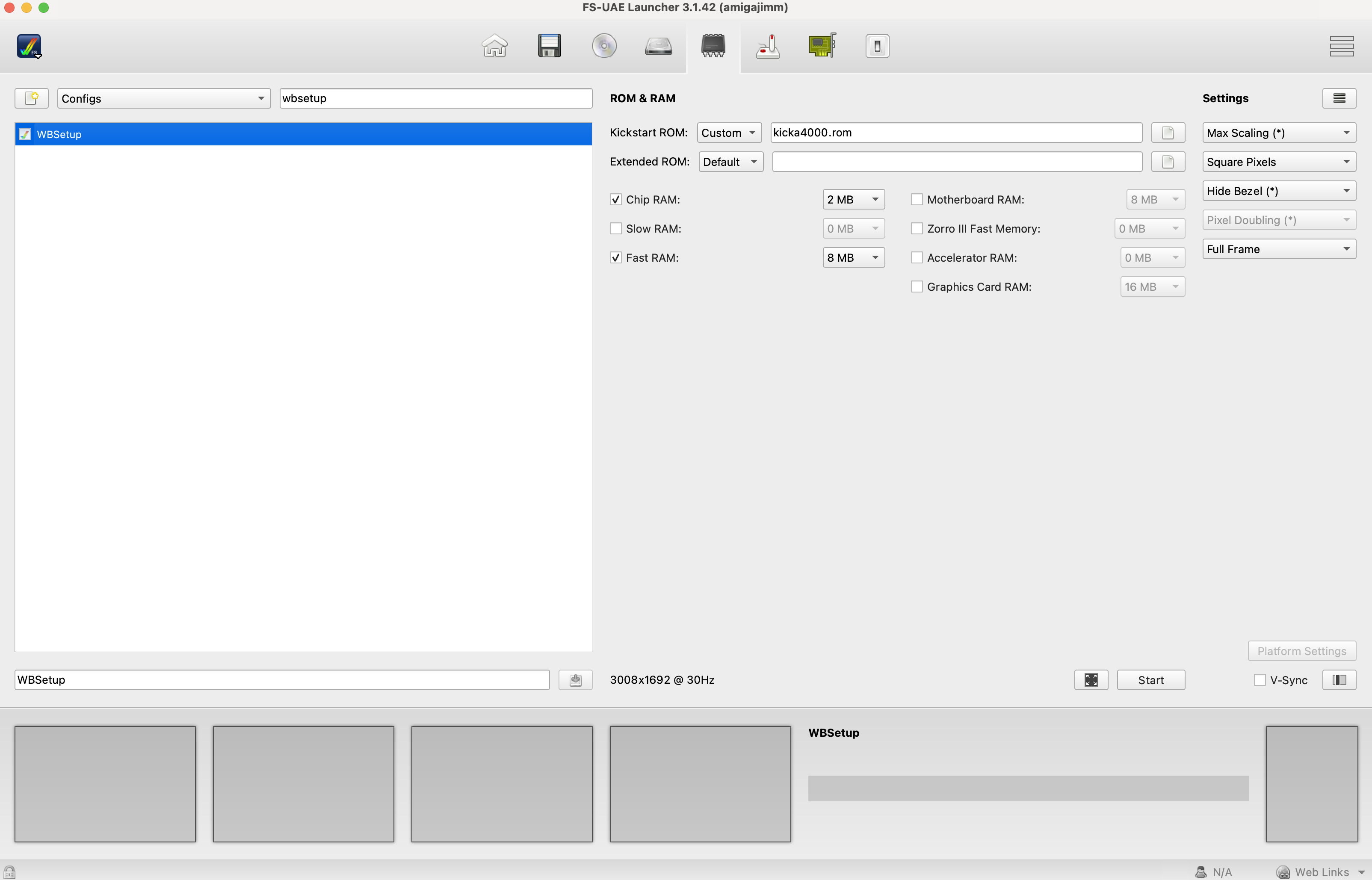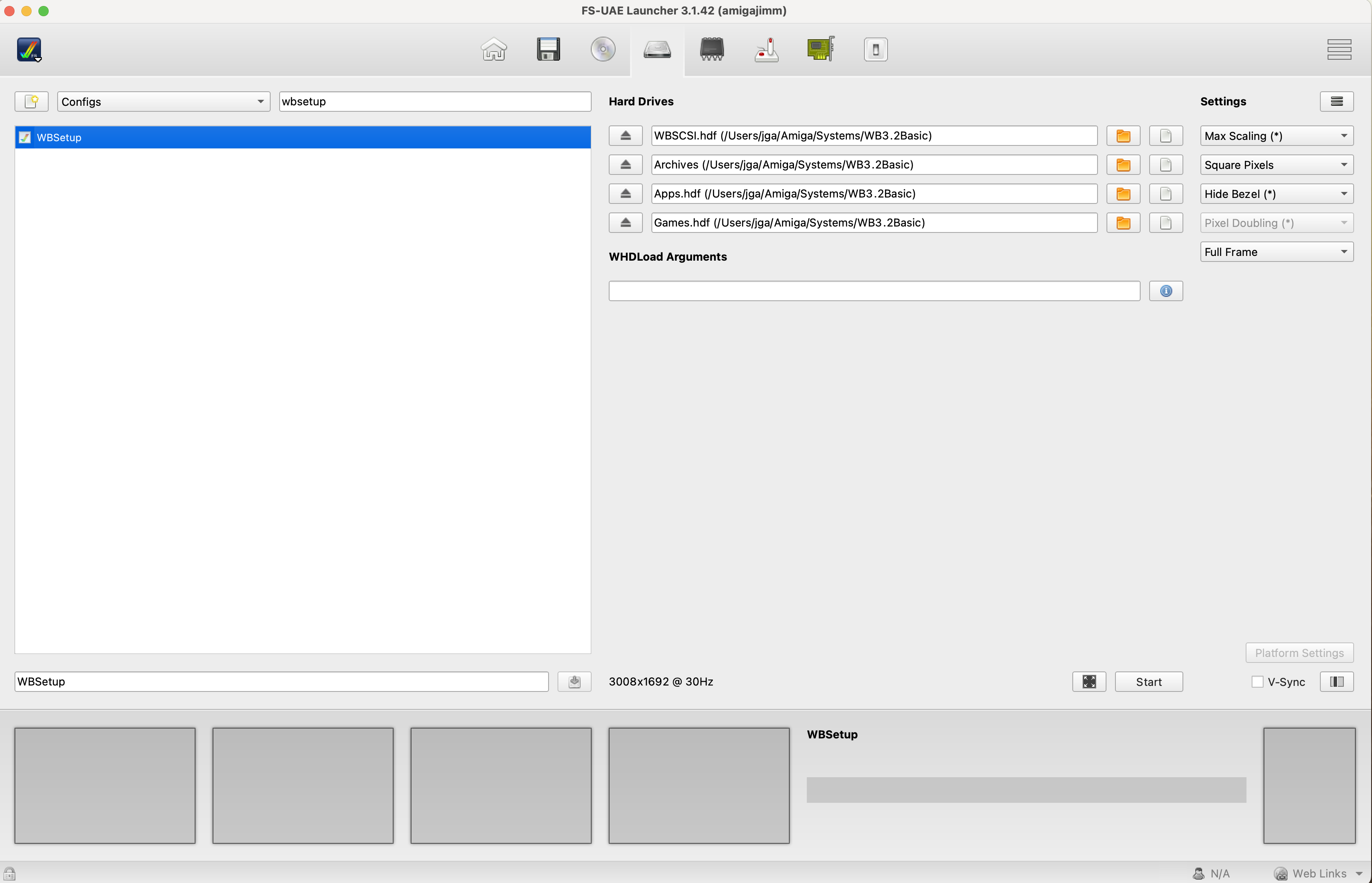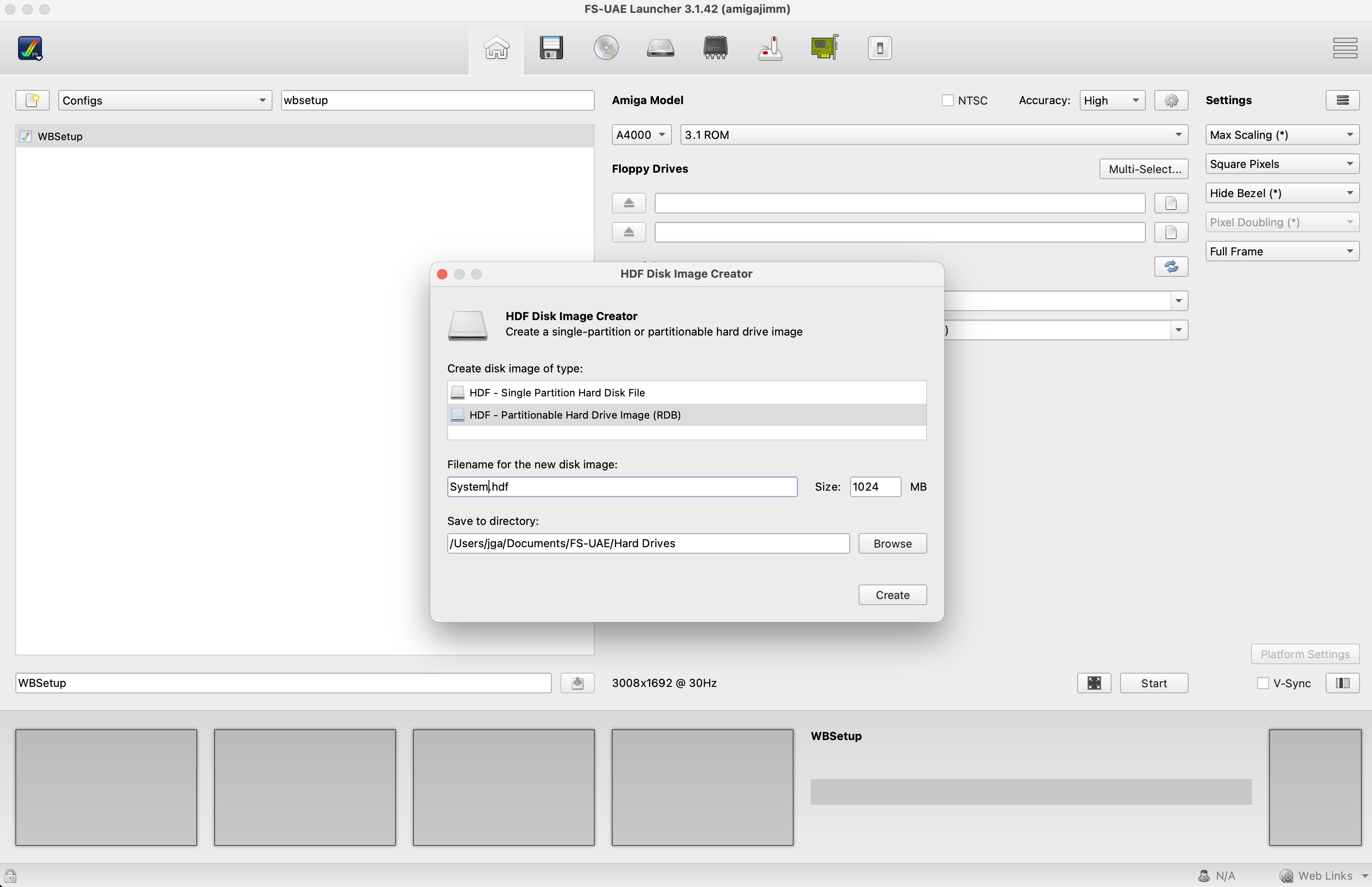 For the config shown I have created one RDB HDF based drive image (WBScsi) and two single partition images (Games and Apps) and created a fourth (Archives) which uses a directory on my Mac HDD.
