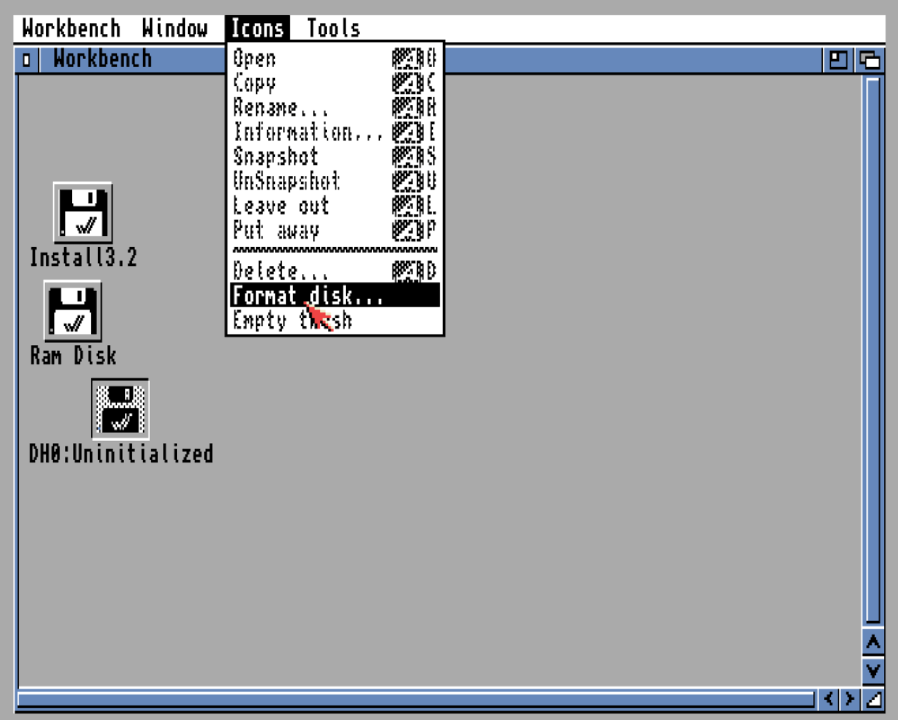 The next part might be a little unintuitive to Windows and Mac users of today. To format the drive we don’t use the HDToolBox application as you may expect, rather we select DH0: then hold the right mouse button and once again go to the Icons menu. From here select the Format disk item