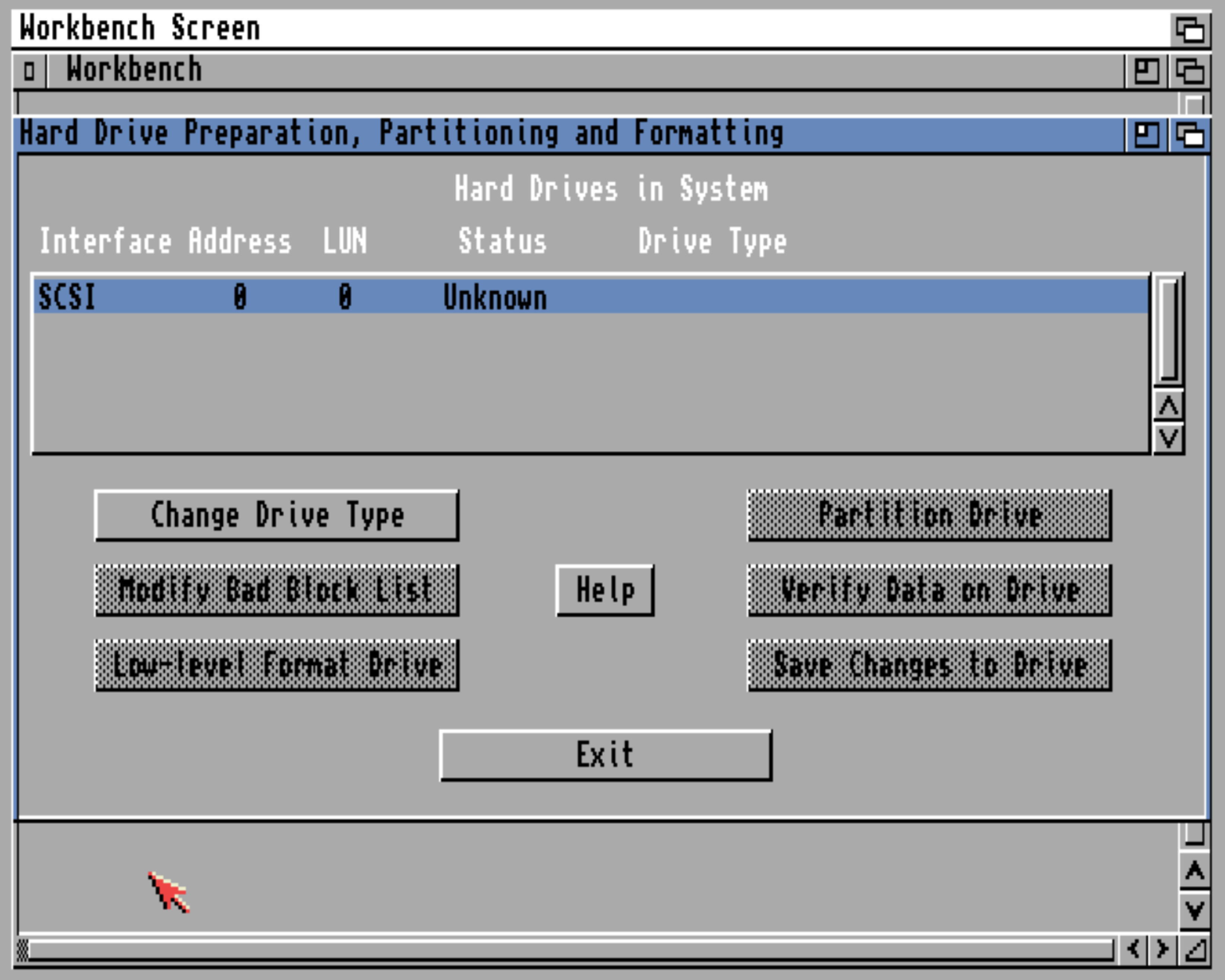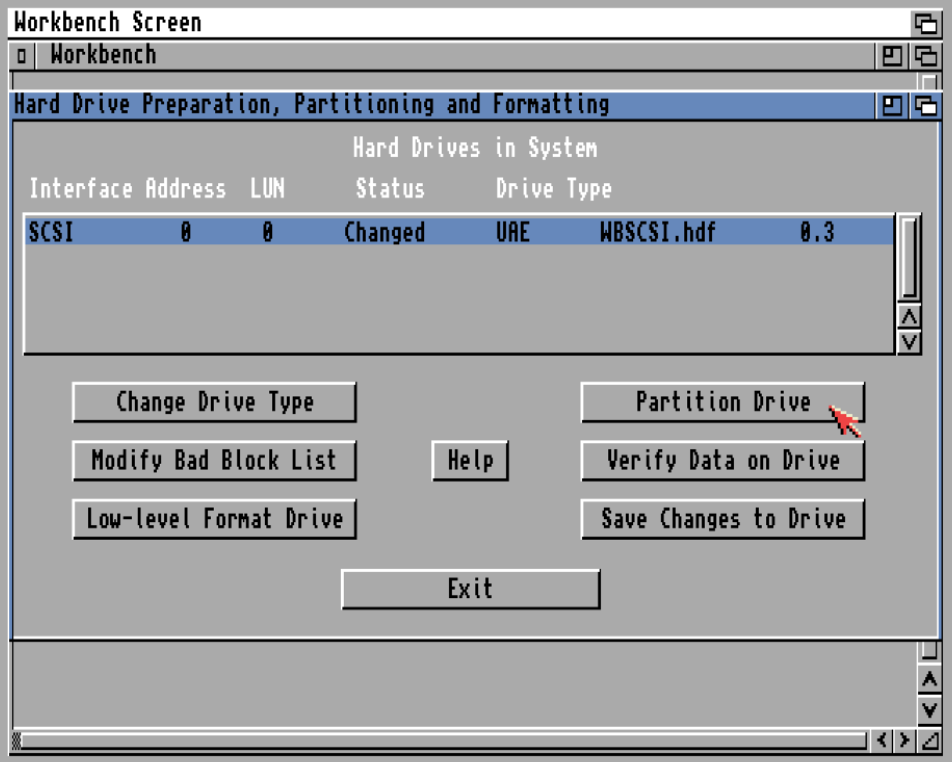 For simplicity of explanation of the AmigaOS setup I will disconnect the other three drives from the emulator and focus only on the main system drive (WBScsi), configuring the other drive images is a simple matter of formatting them (see below) and the Archives directory based HD will be available as is in the OS with no need to do anything.