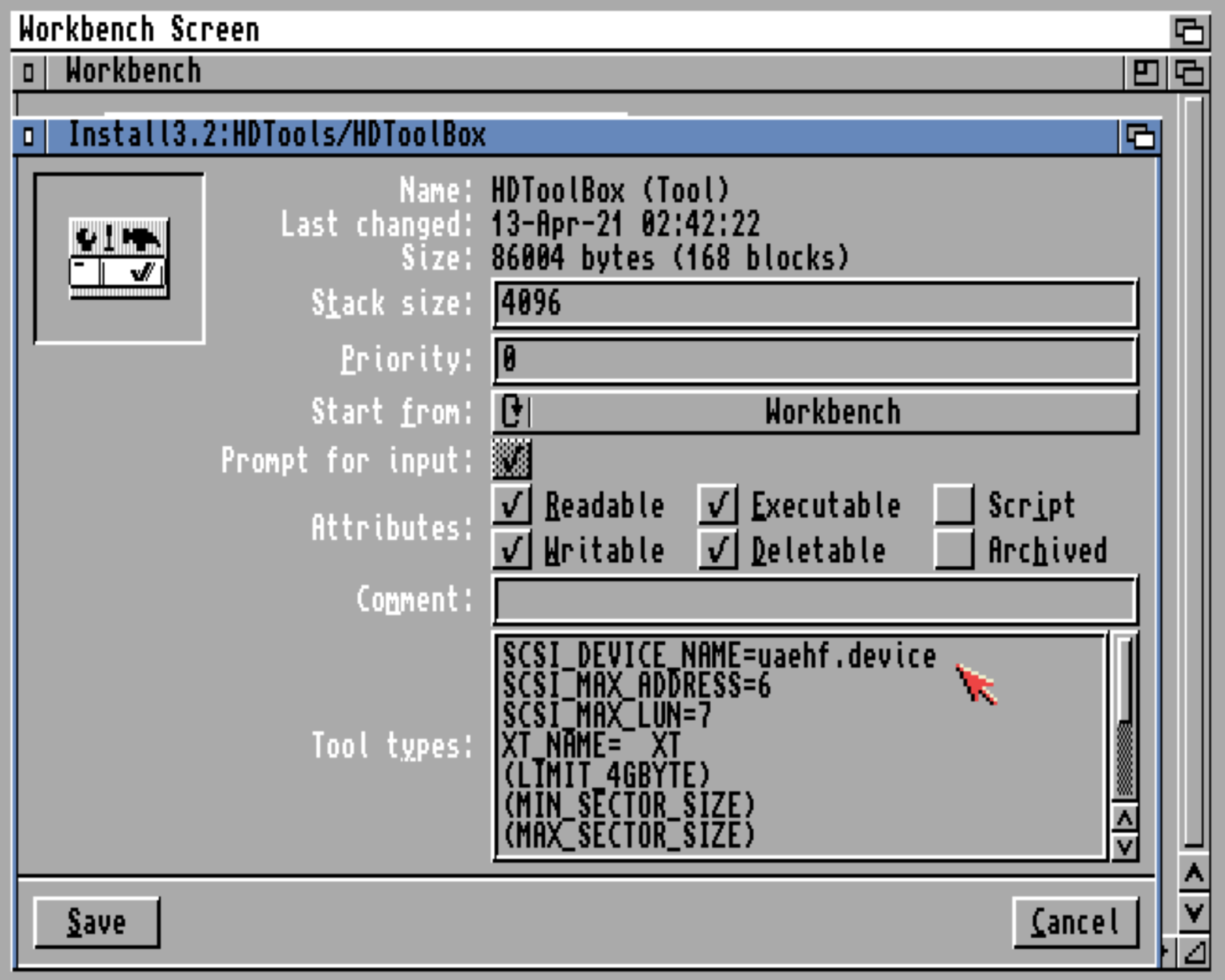 In the Tool types textbox the SCSI_DEVICE_NAME setting will show scsi.device. We need to change that to be uaehf.device Click Save to save the configuration and close the window.