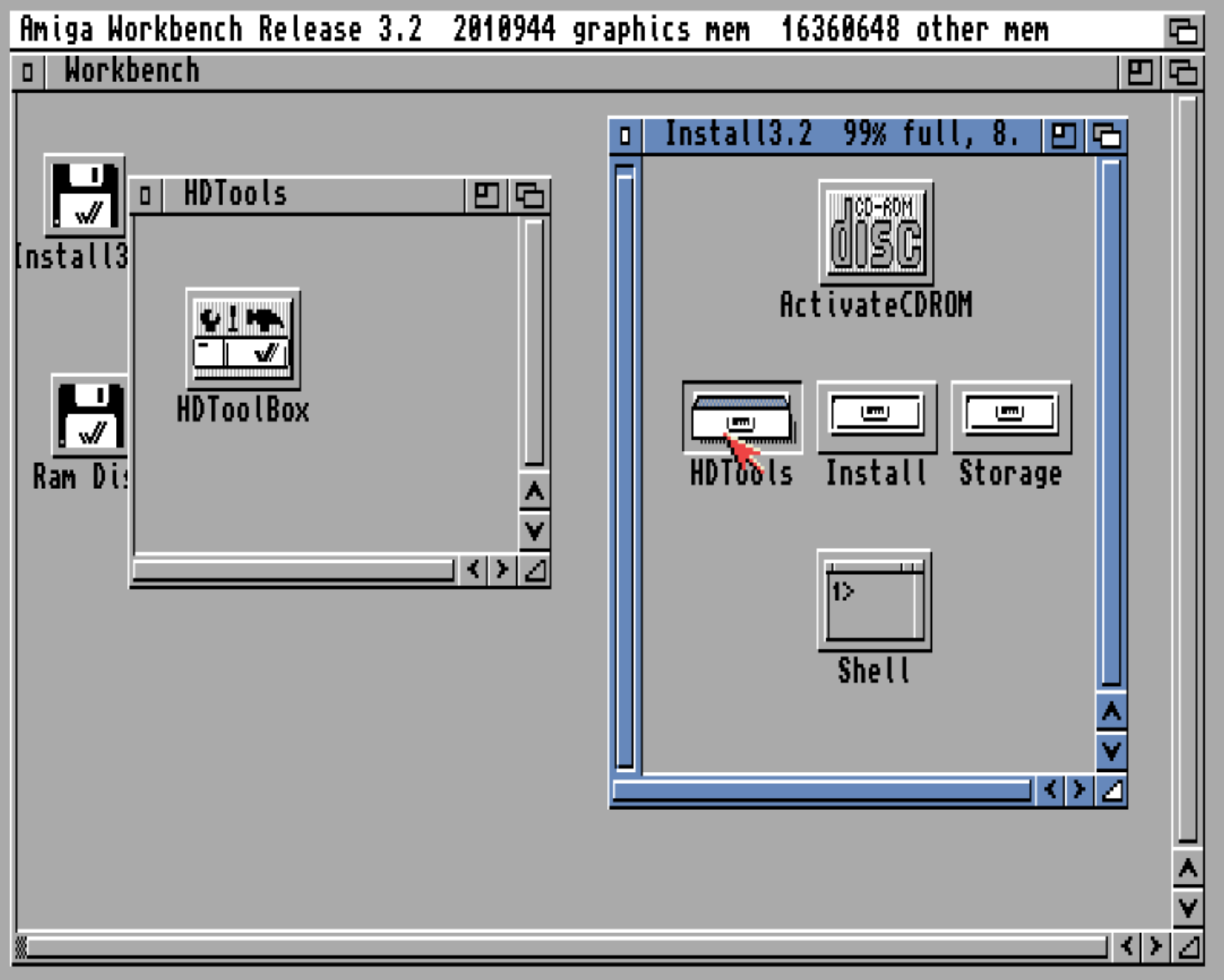 Opening the Install 3.2 disk reveals the HD Tools drawer (AmigaOS terminology for a directory in the UI). Inside of the HD Tools drawer we see the HDToolBox application.