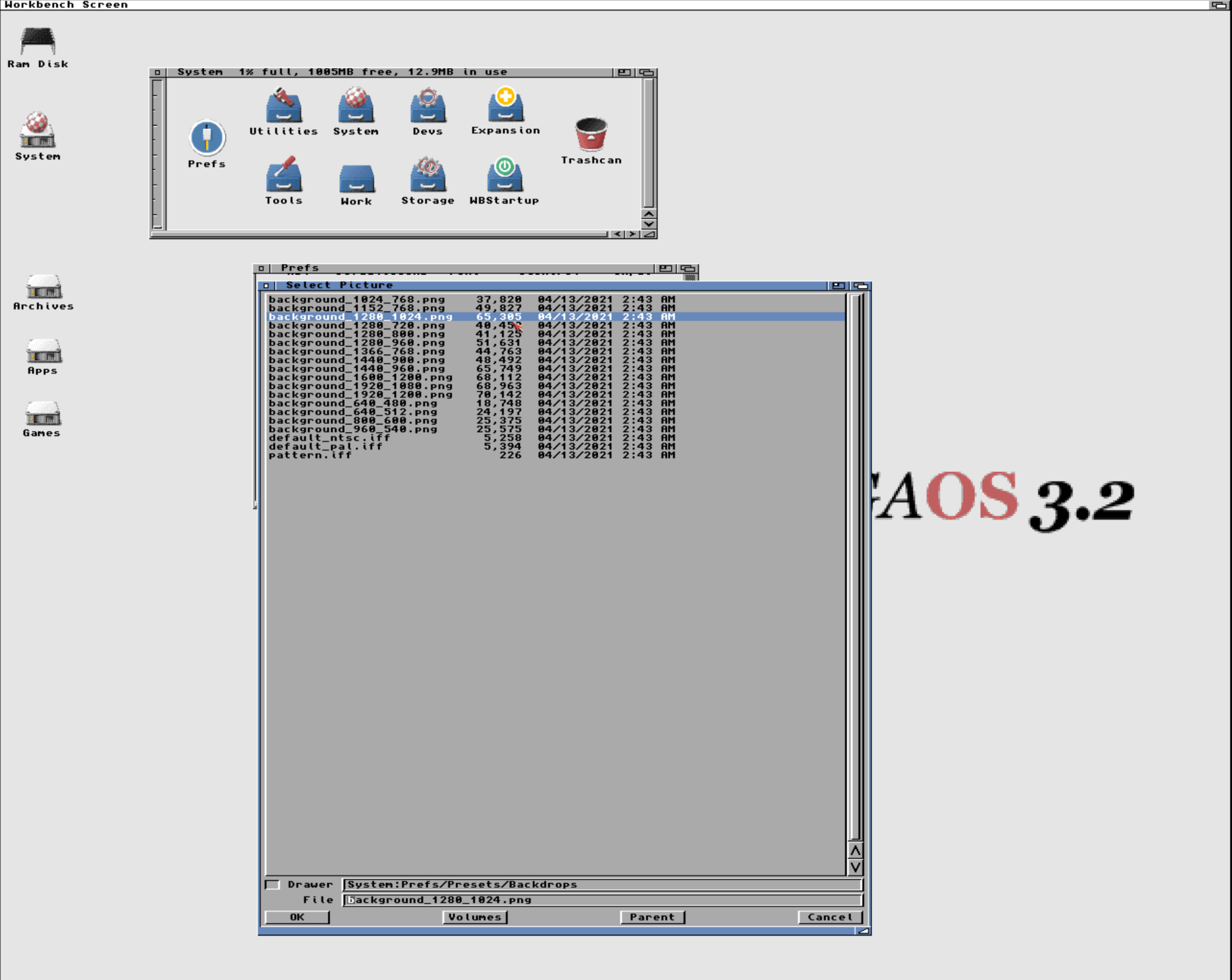 Important Note: You may get a message saying the image you chose can’t be loaded. This is because our Amiga only has a few megabytes of memory available, not enough to load the higher resolution png for the background image. You can either stick with the lower res picture or shutdown the Amiga and adjust the memory in the emulator, giving the emulated machine more memory.
