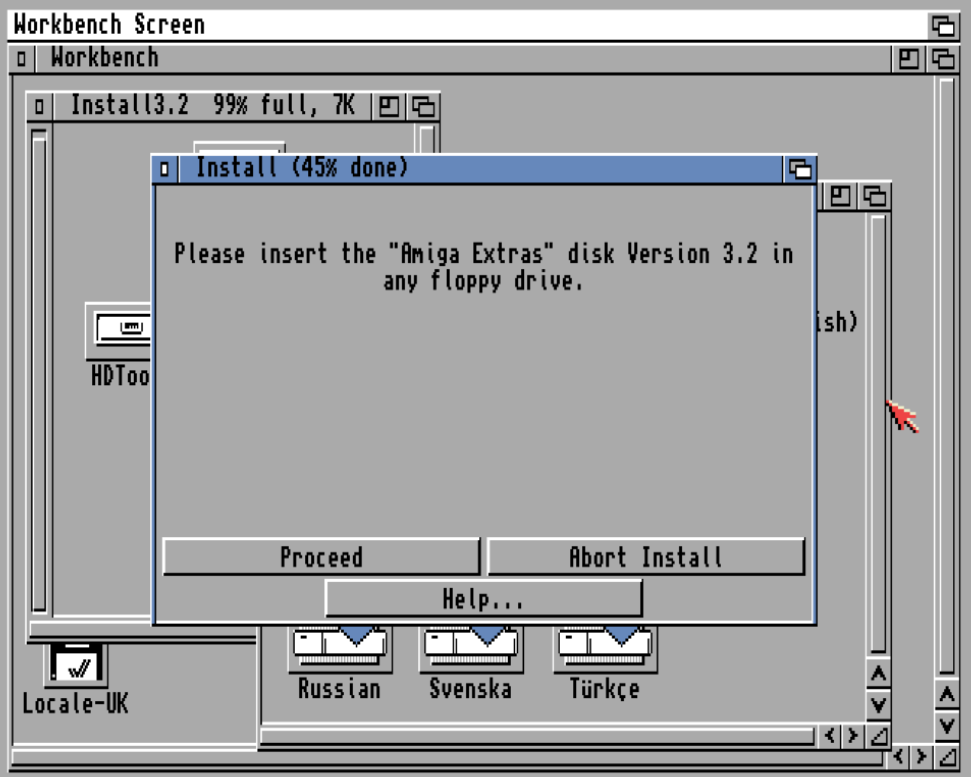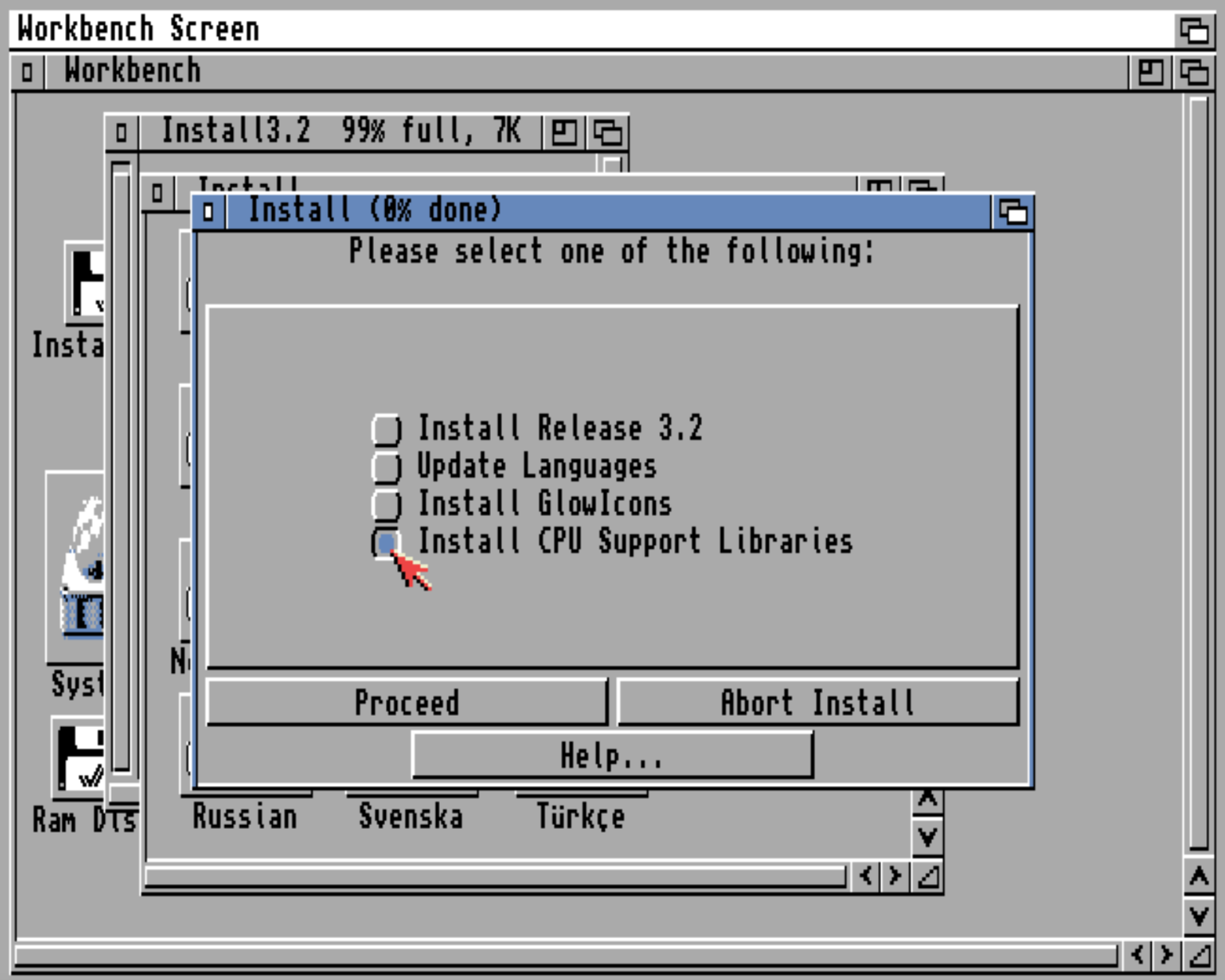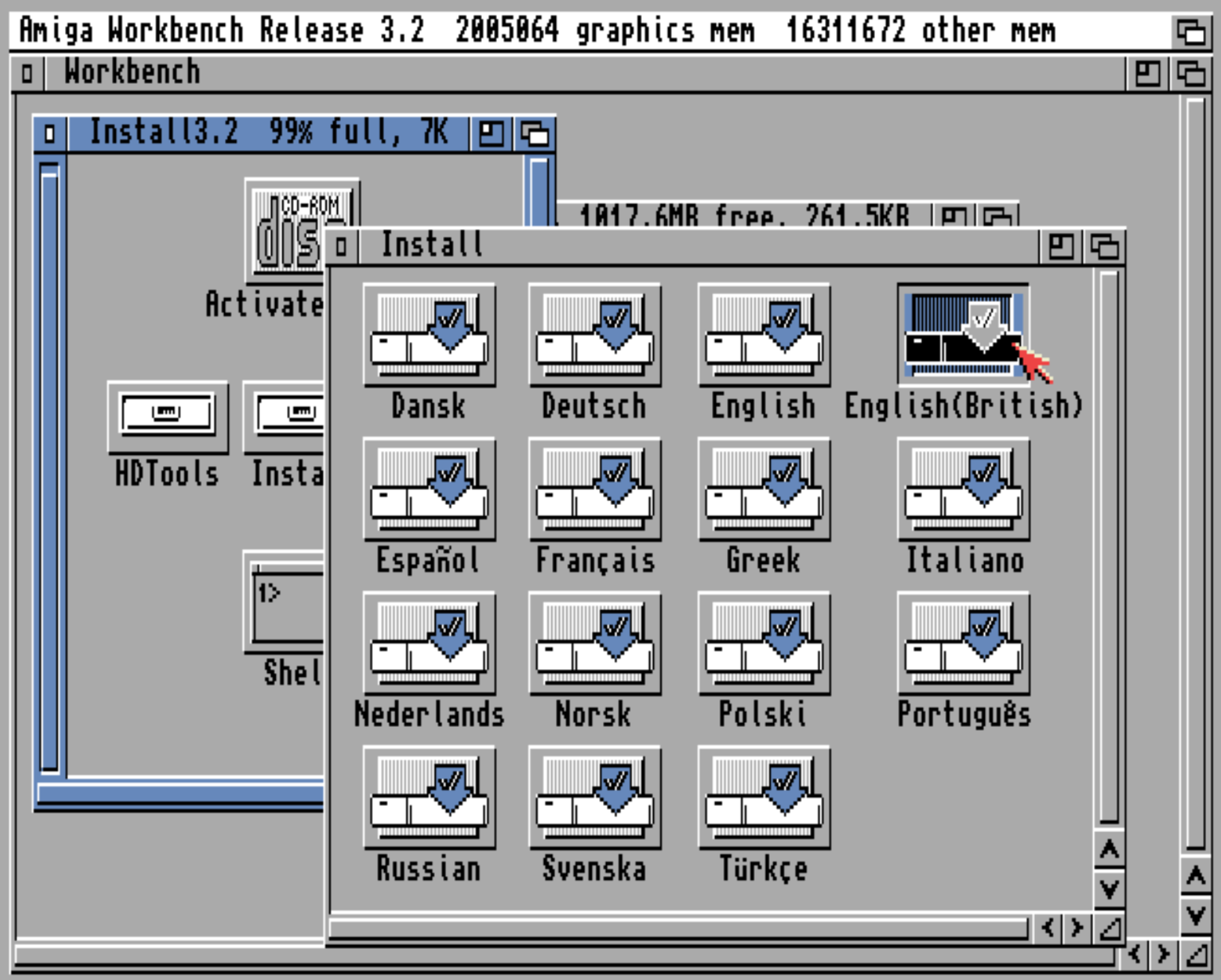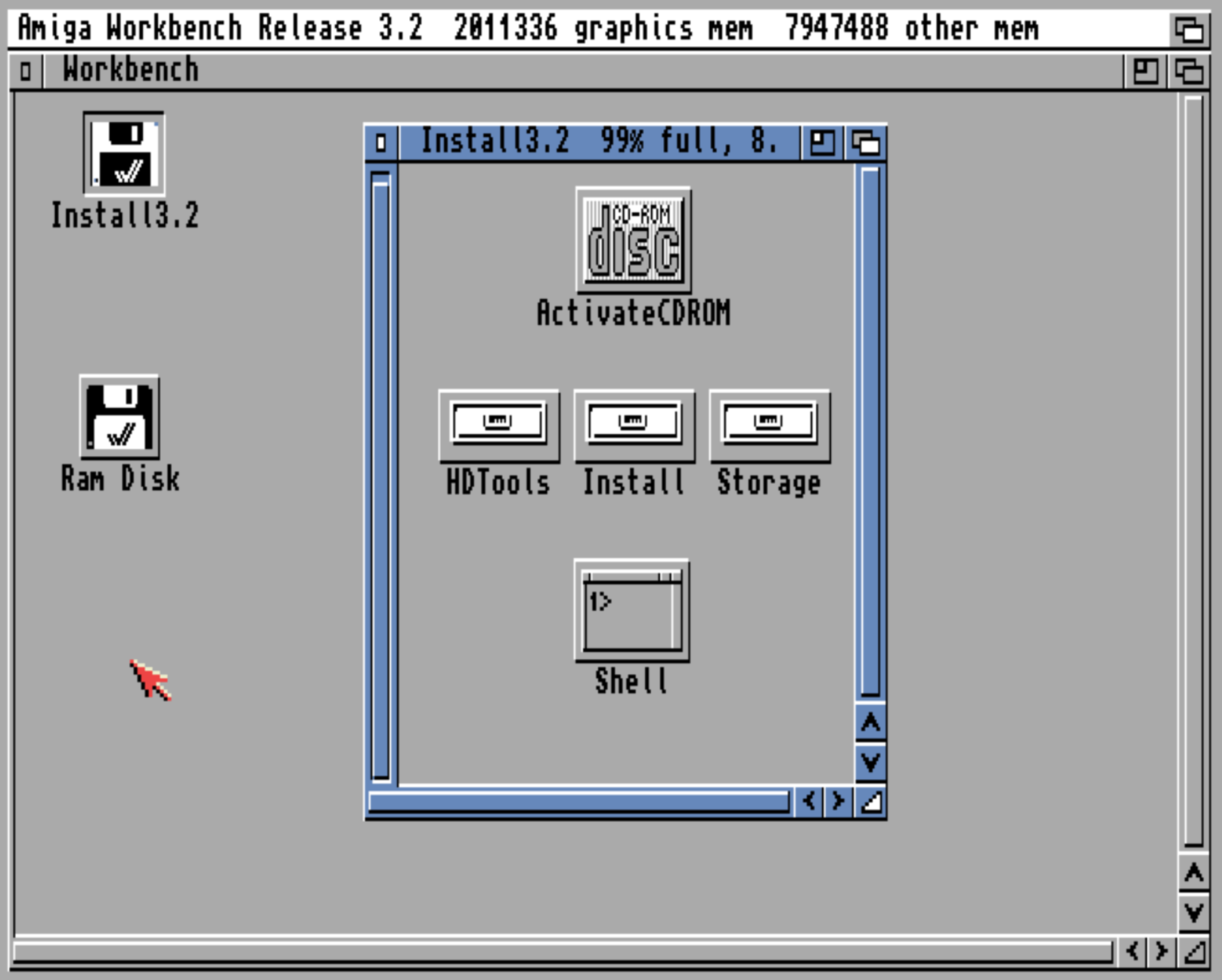 The emulator will boot off the install floppy image and into Workbench 3.2