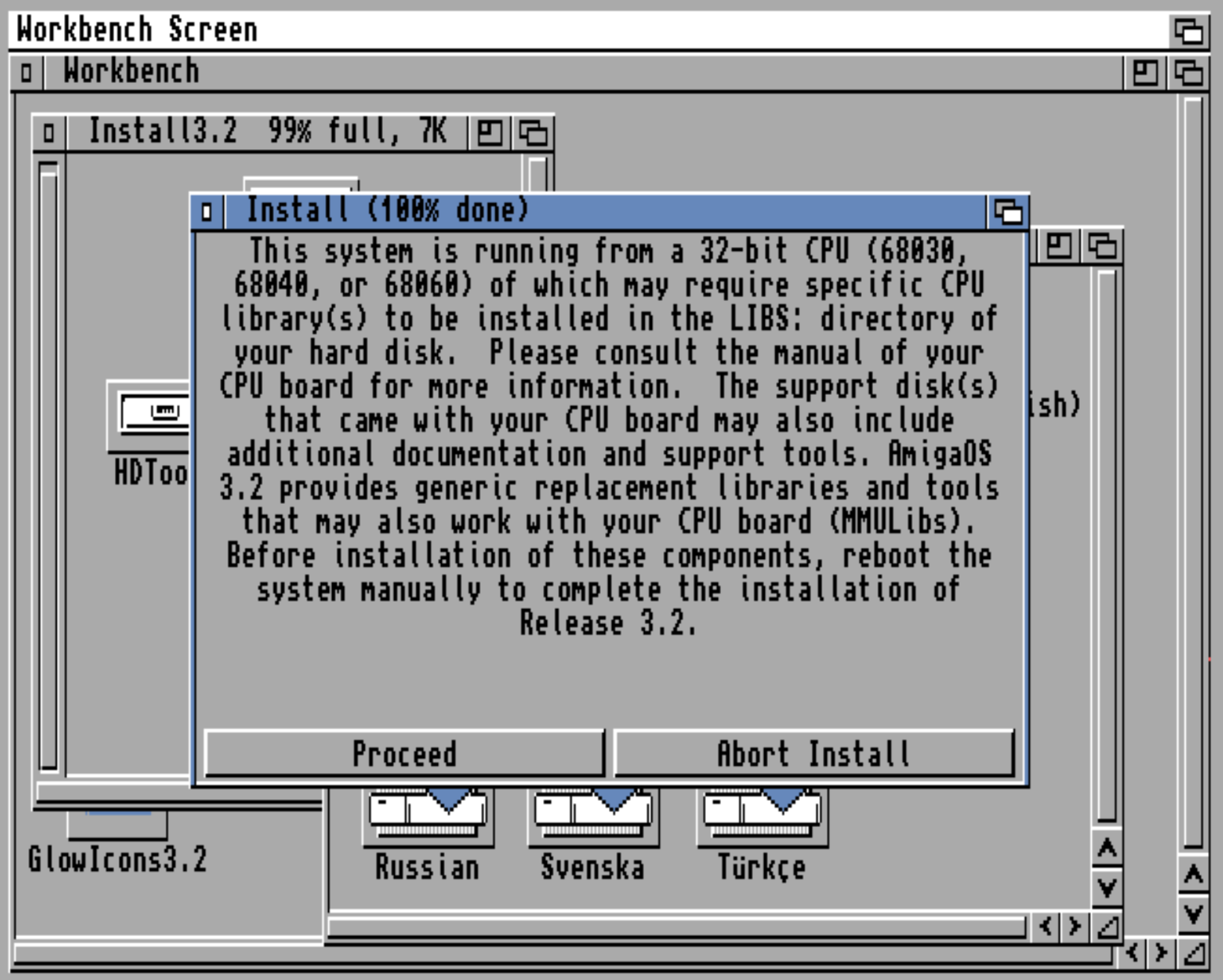 Continue swapping in disks as the installer asks for them. At the end of the install the installer will note that we have a 32-bit CPU and ask us to reboot to complete the install. Exit the installer and restart the emulator as required. Leaving the install floppy image mounted in DF0:
