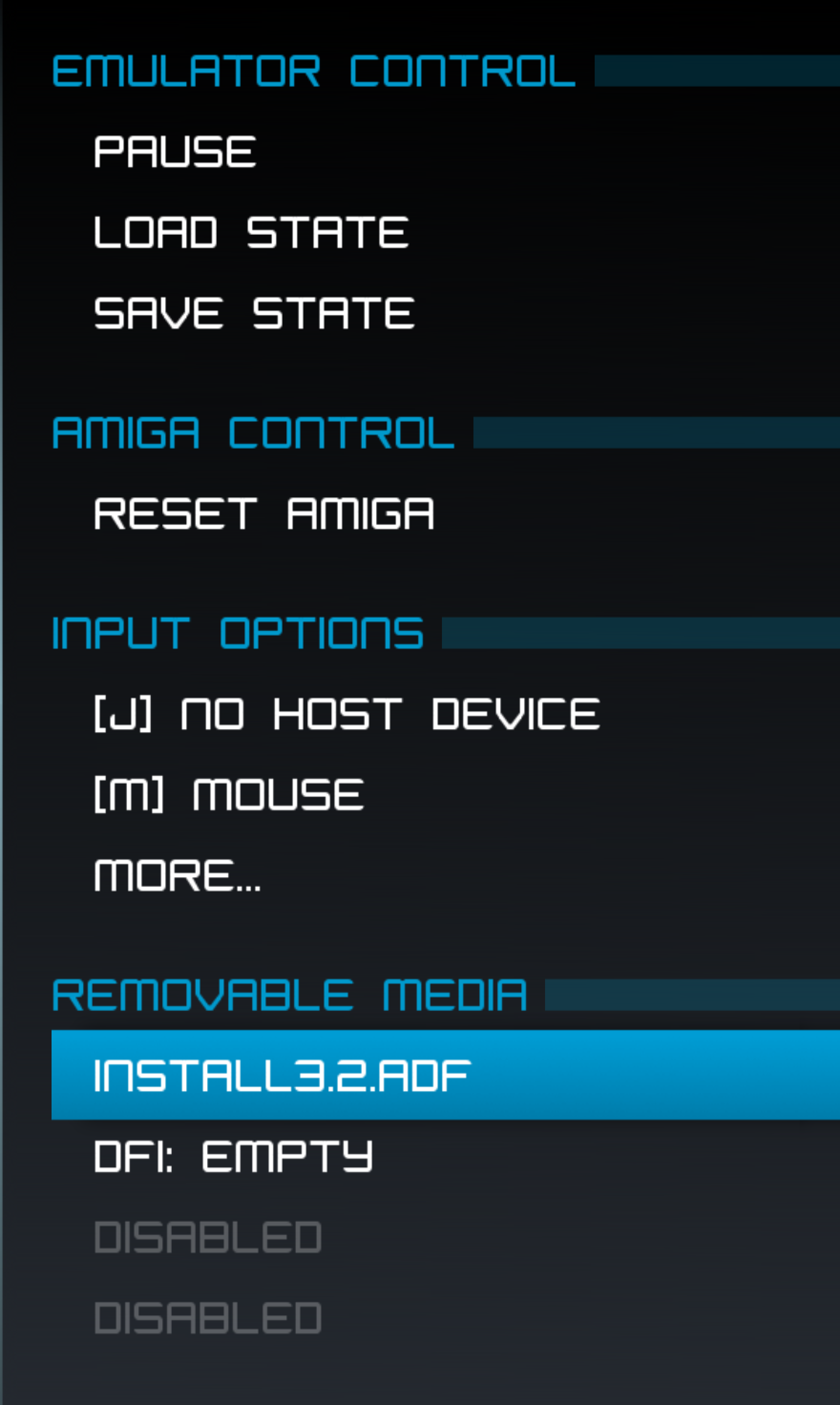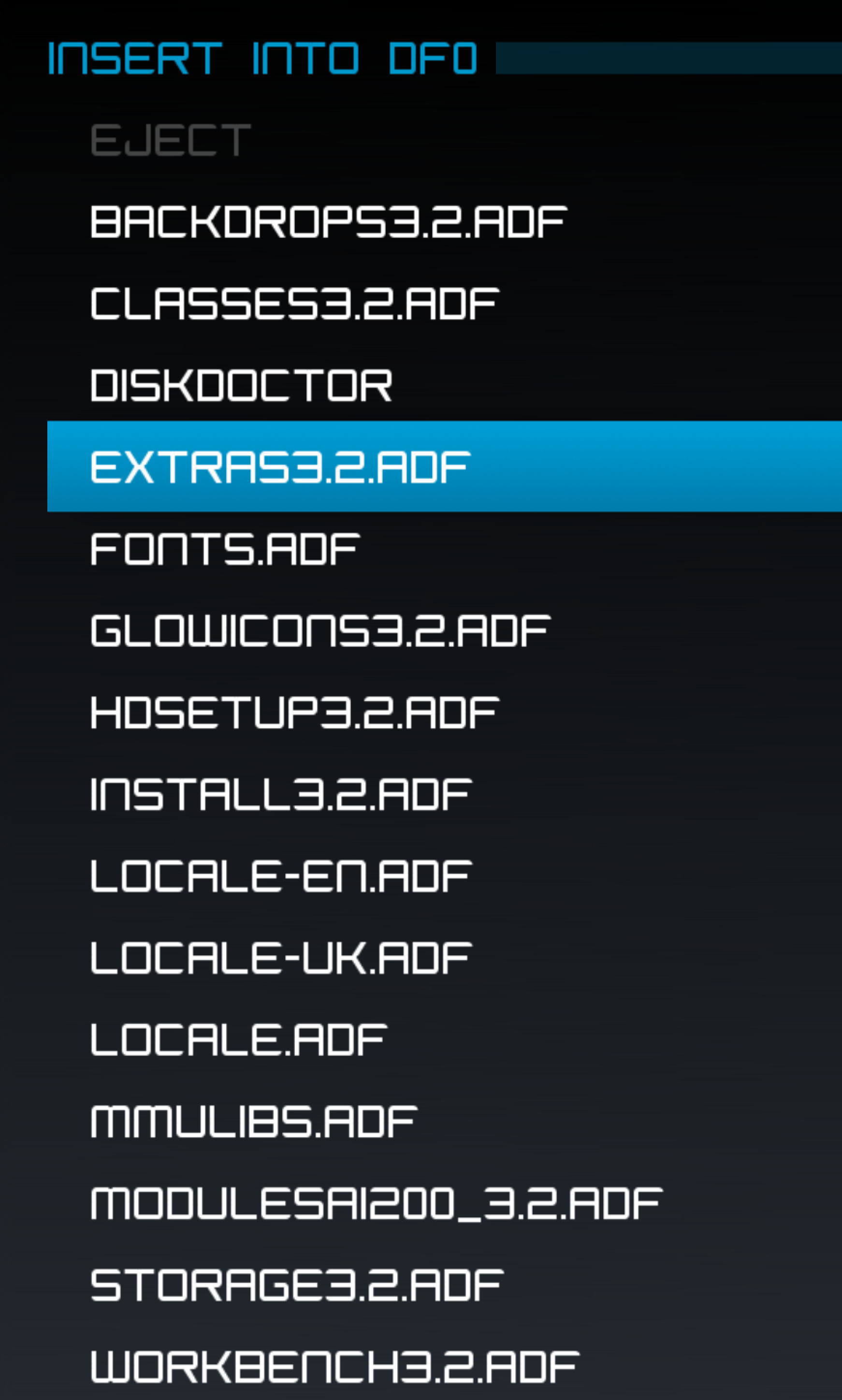 This will bring up the available media to swap into DF0:. i.e. the list of ADF’s we included in the media swap options. Browse to the disk image the installed is asking for and select it then exit settings options.