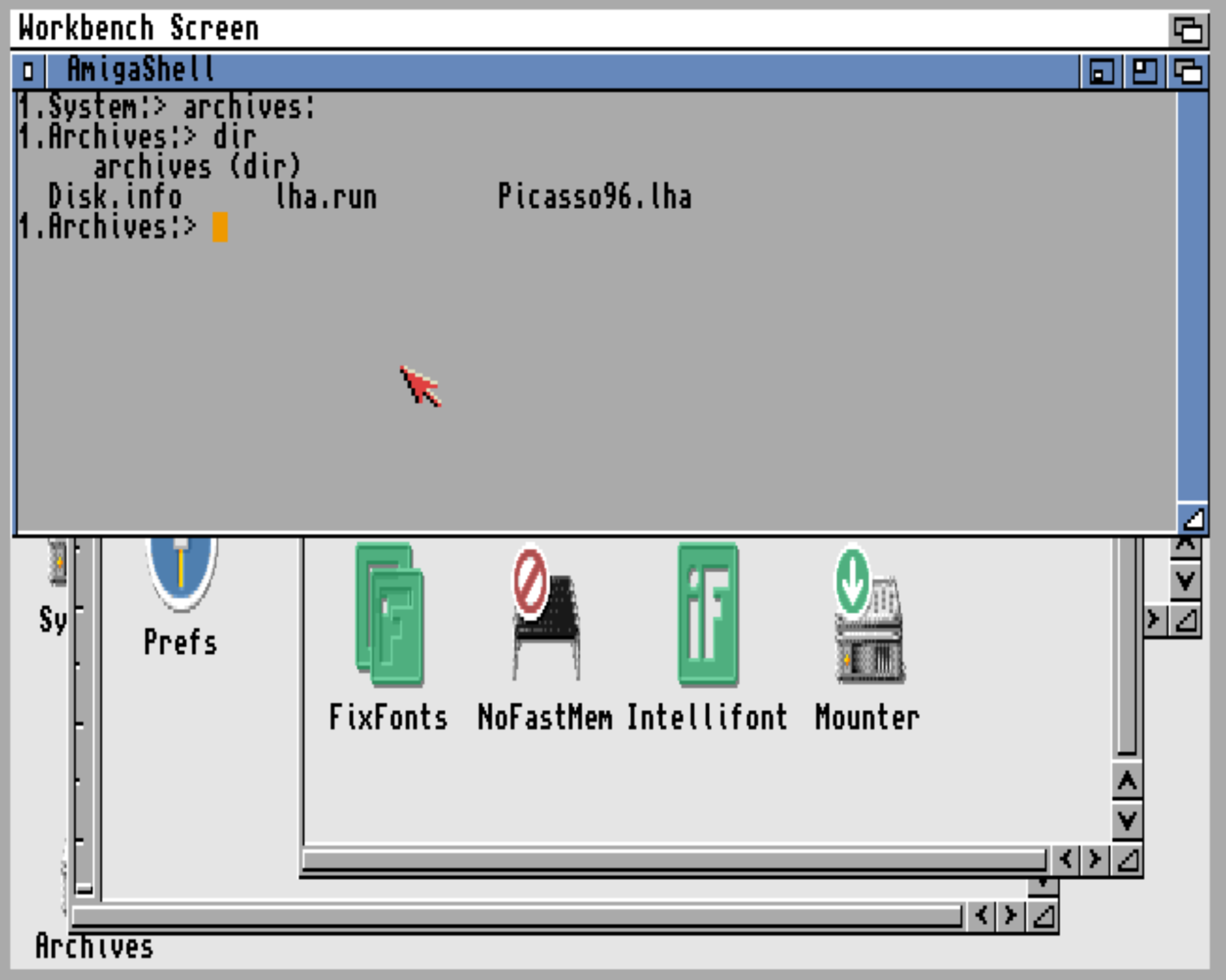 For now we are done with the shell. It can be closed. Navigate back to the Archives drive. Either close the Archives drive window and reopen it or select Update from the Window Menu to refresh the icons. You should see the icons for the lha tools and a new drawer called Picasso96Install