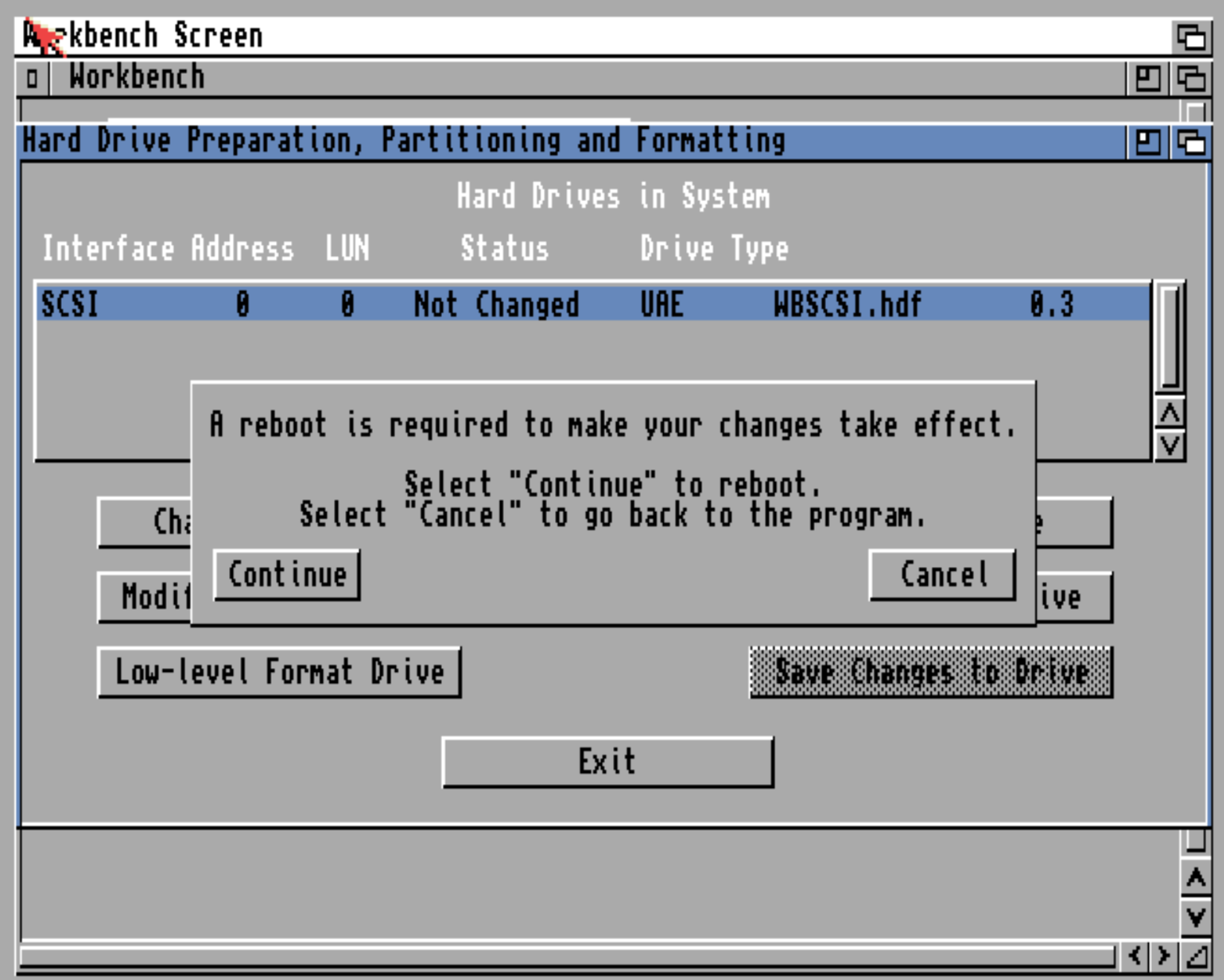 On the main window click Save Changes this will let you know that clicking Continue will reboot the Amiga.