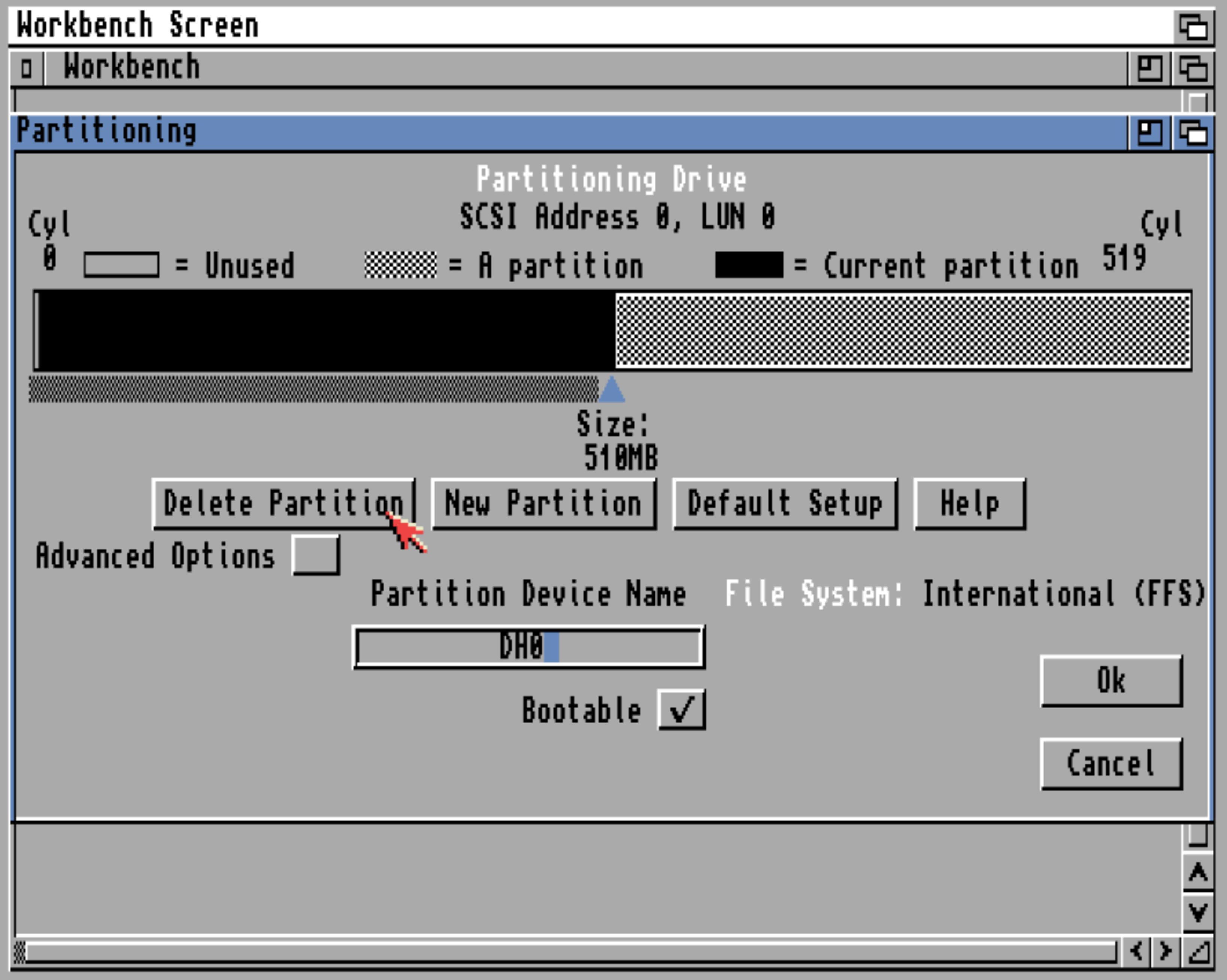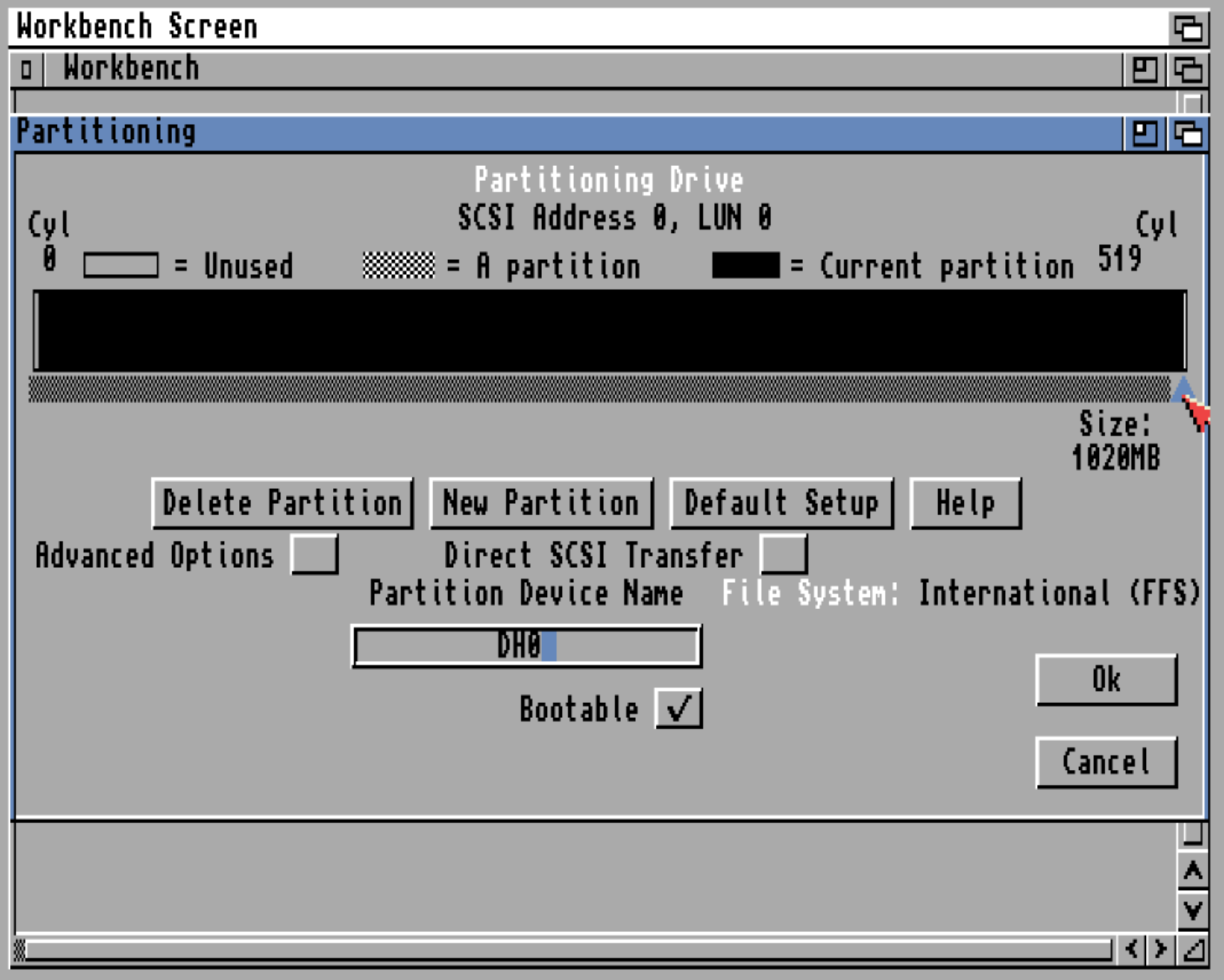 Next create a new partition and drag the blue arrow all the way to the right to configure it to use all the disk. I like to name this device DH0, in keeping with original Amiga hardware.