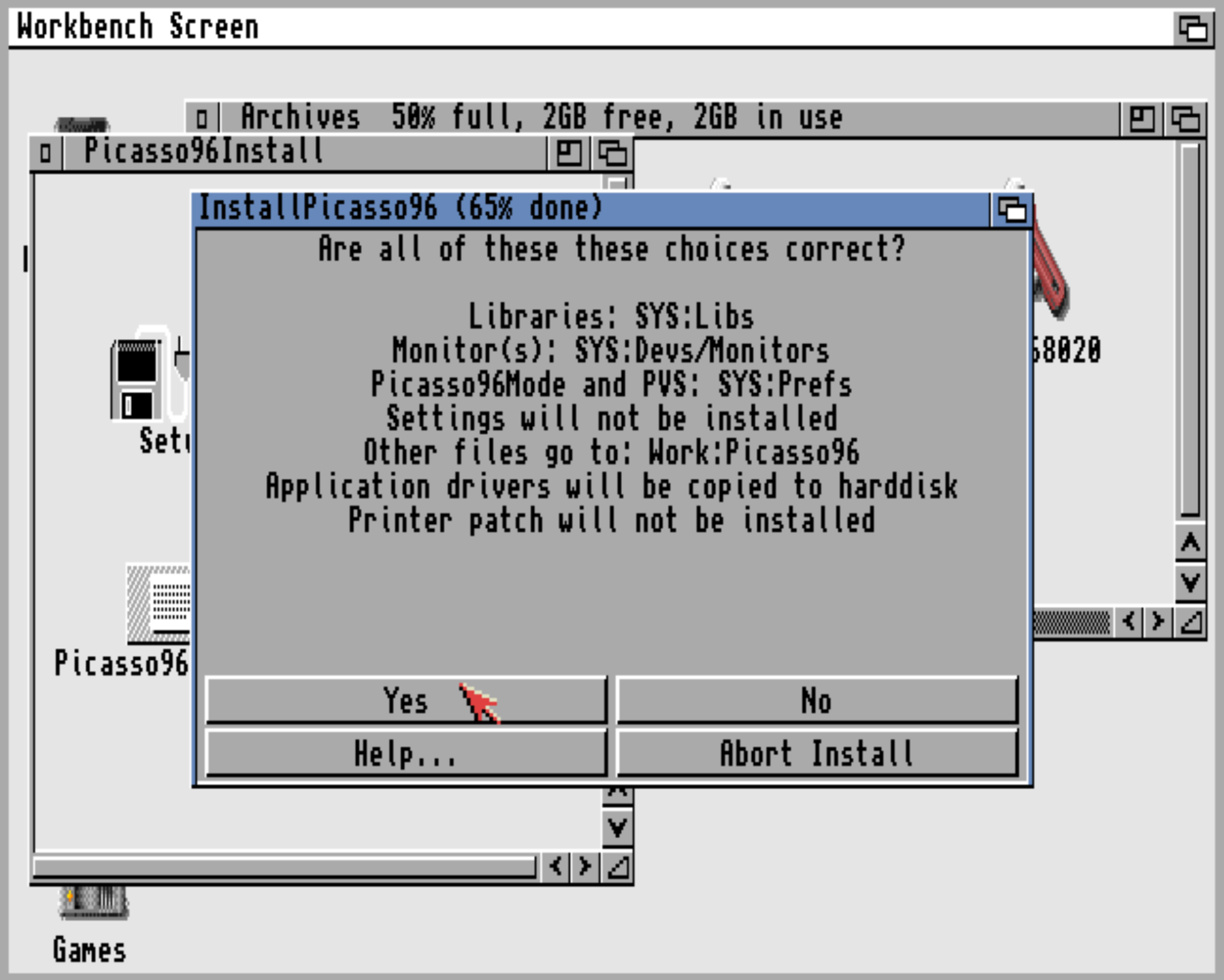 We get a final screen showing the options we selected and we get a last chance to abort. Note in the screenshot I have chosen all the default locations. Click Yes to install Picasso96
