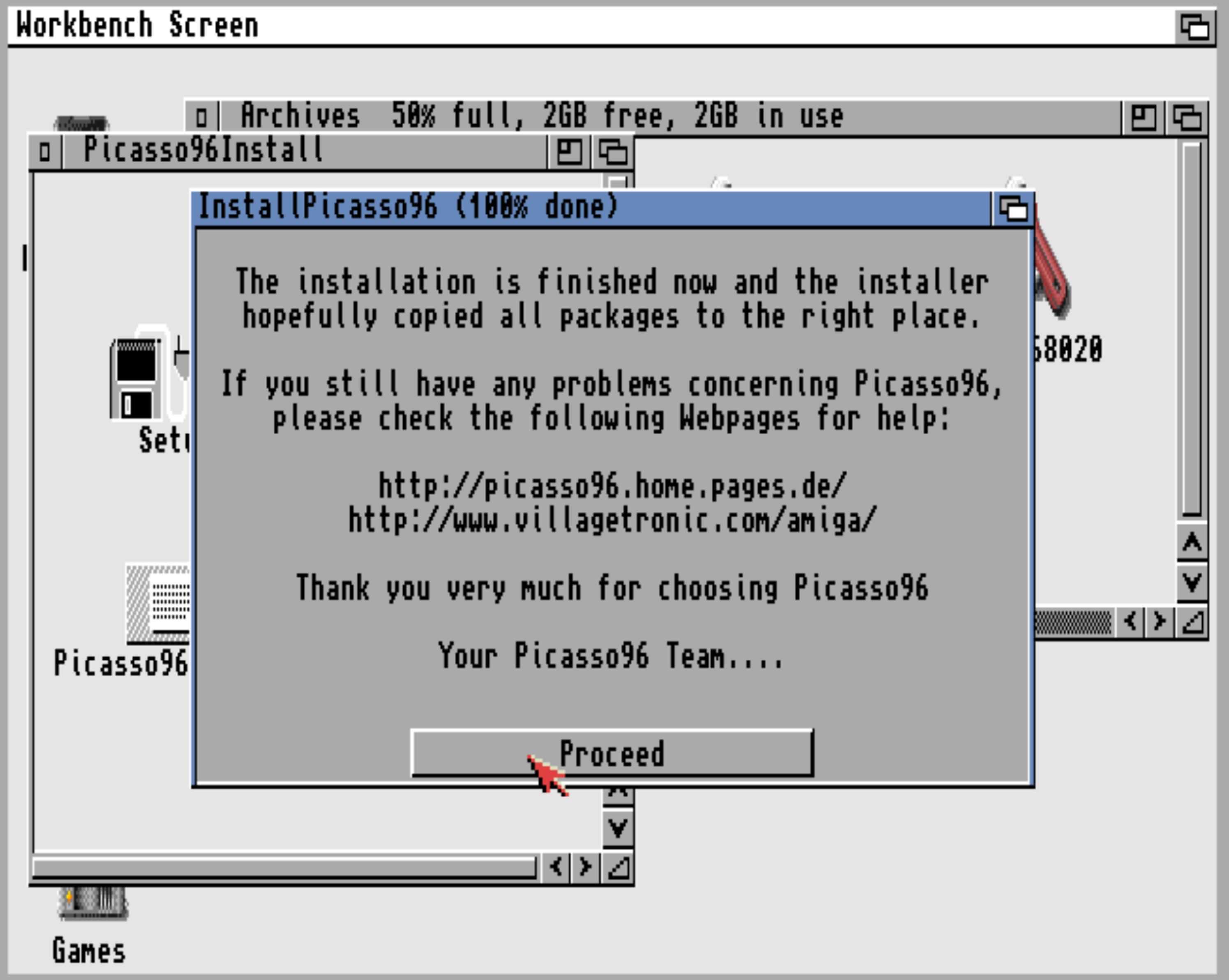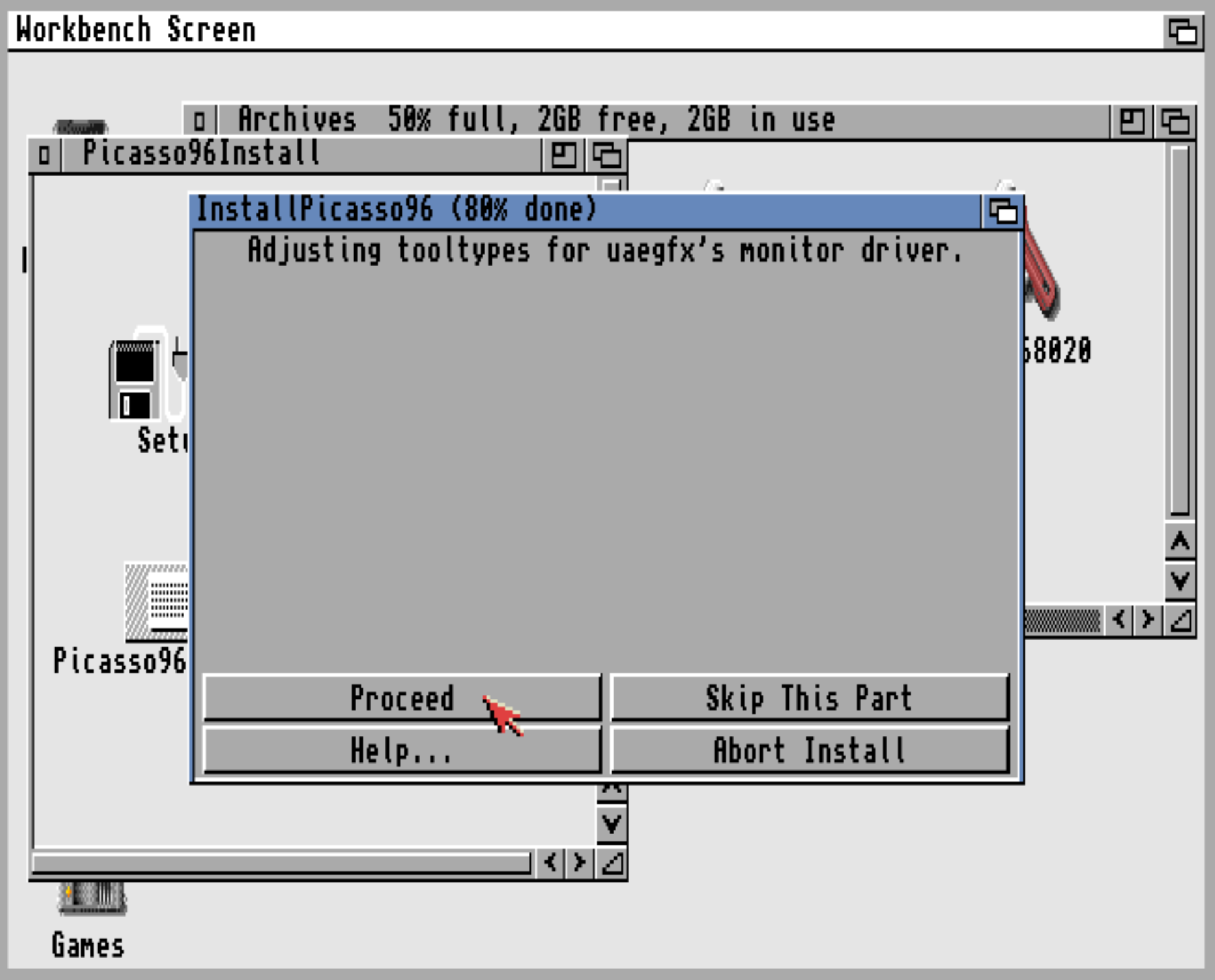 There is a nice affordance here at the end of the install where the installer sets up all the device tooltypes automatically for us. Click Proceed on these and the installer will configure our device drivers to work with UAE and Picasso96 nicely.