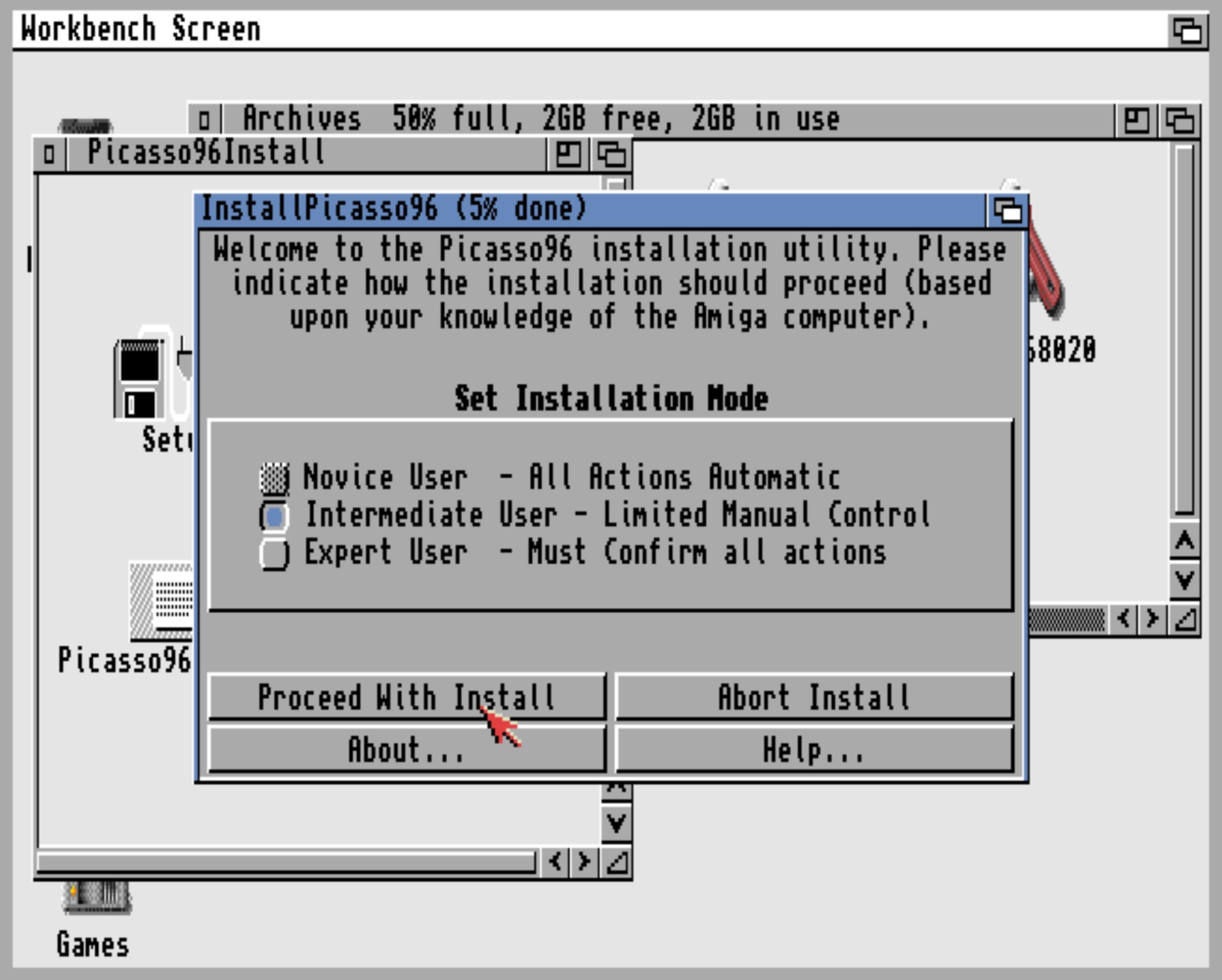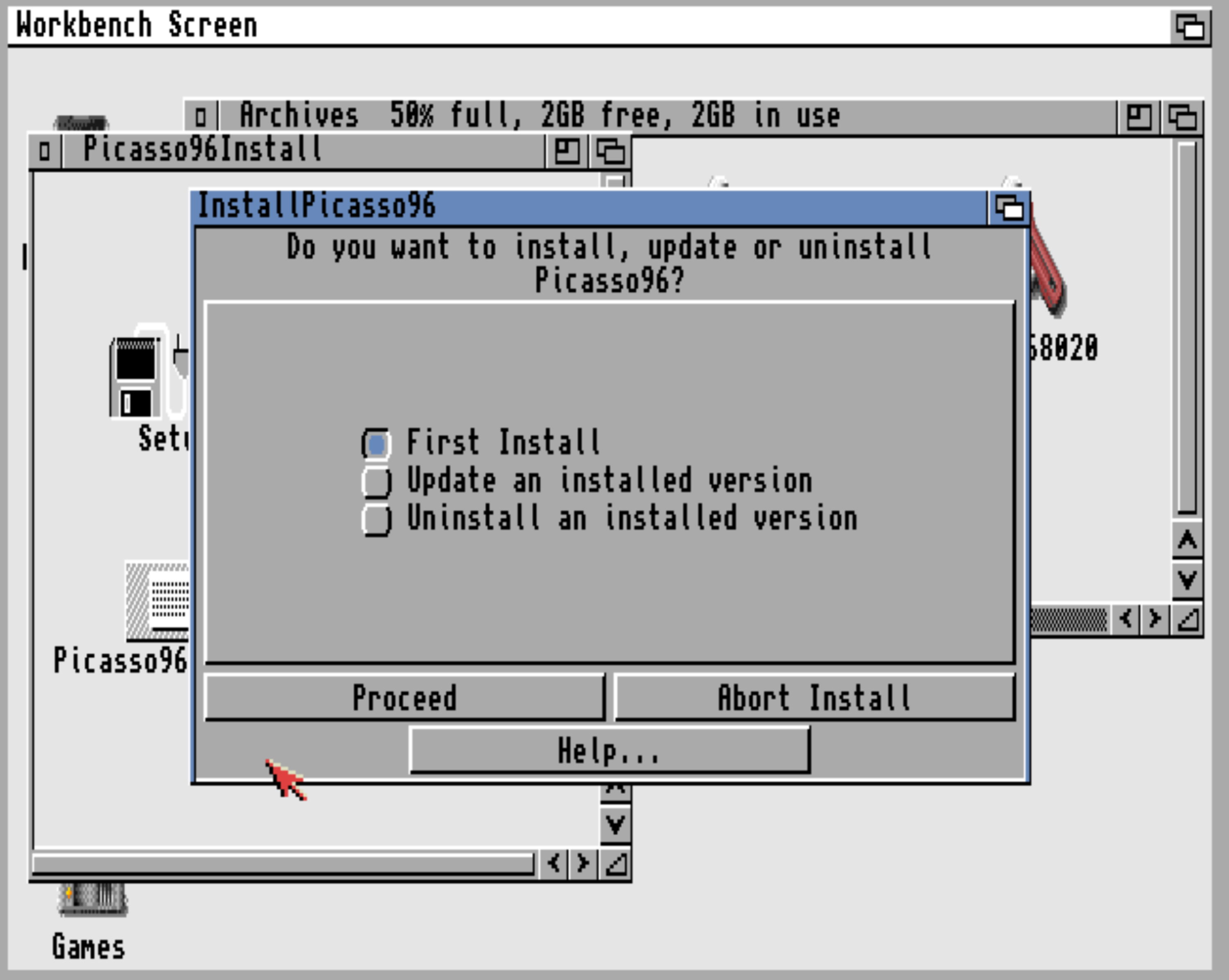 Open the Picasso96Install drawer and run the Setup program to begin setting up Picasso96. Ensure the First Install option is selected and click Proceed