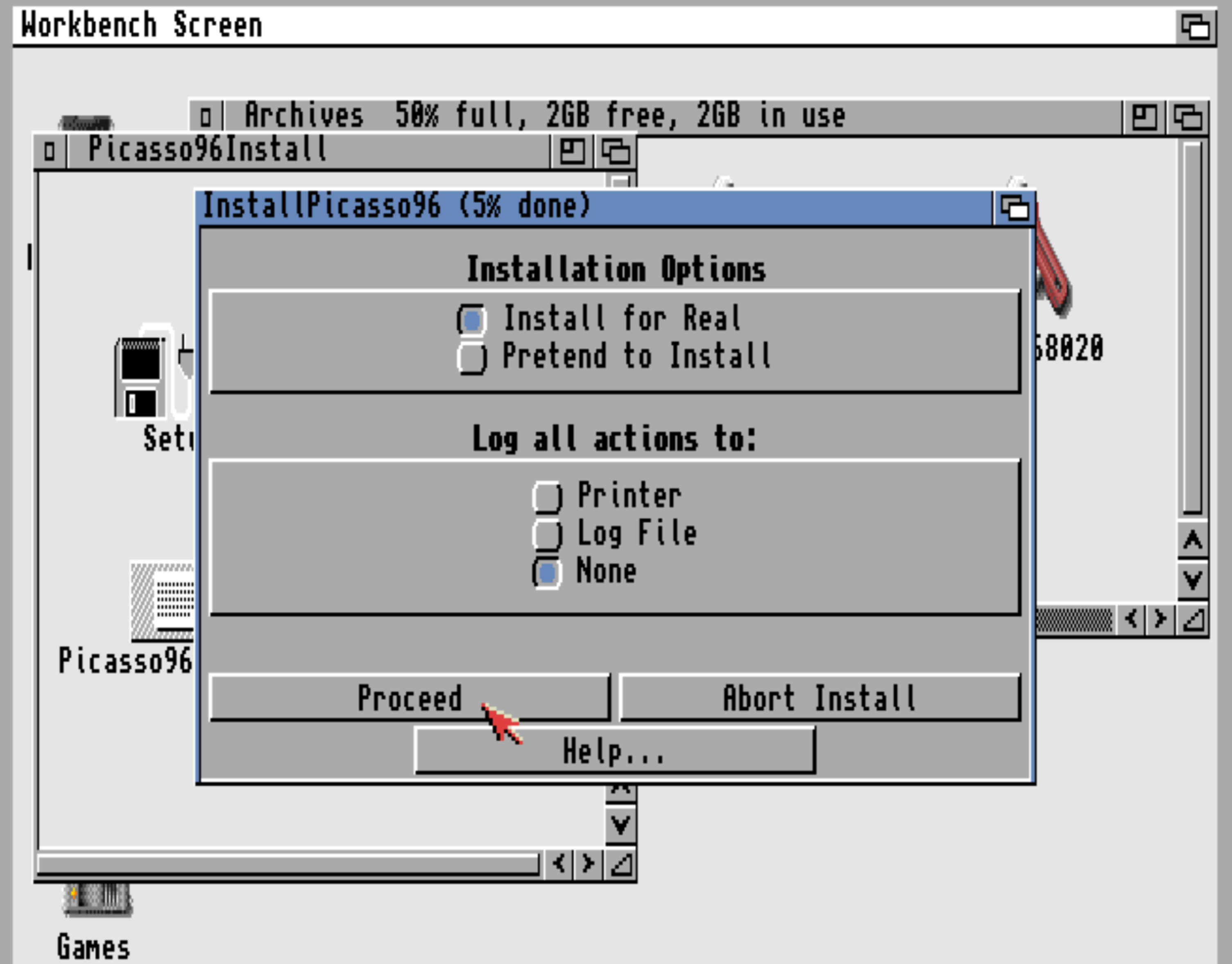 Amiga setups are quite verbose at times. Yes we want to Install for real. Click Proceed