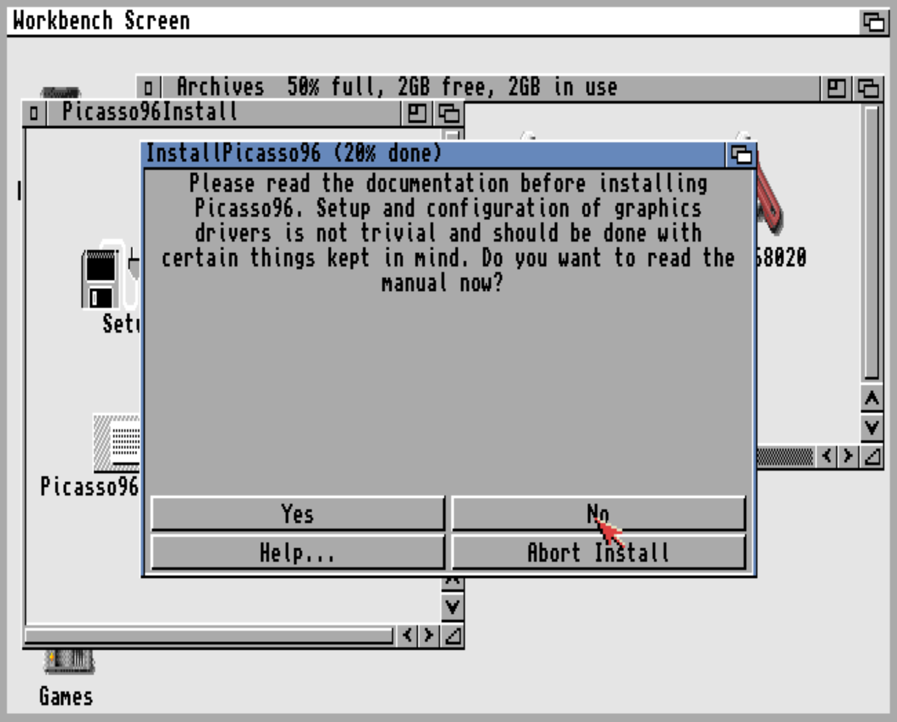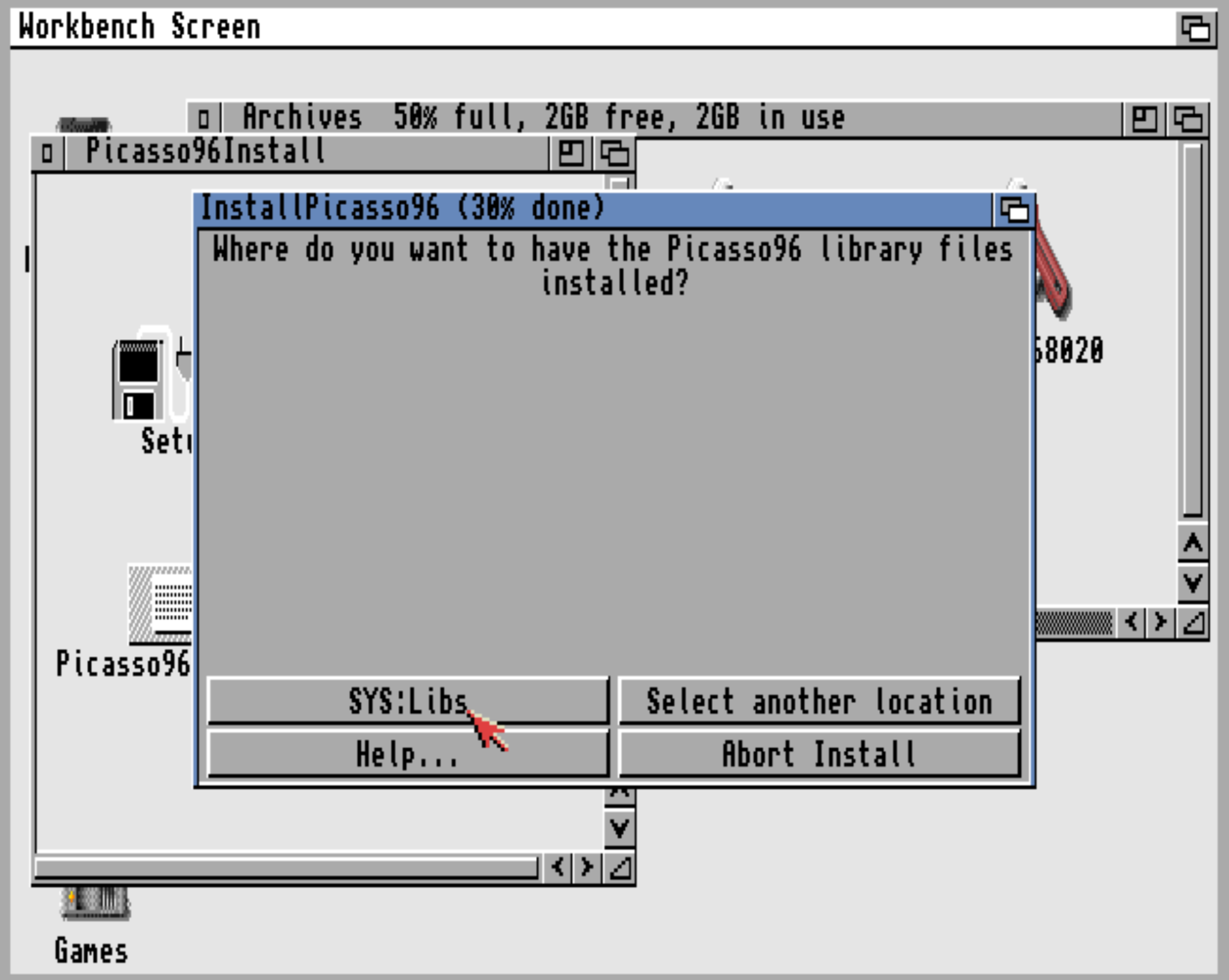 Above in the emulator setup section we chose the UAEGFX graphics card. This can be used to enable different screen modes at higher resolutions with more colour options. In order to enable the card, RTG software libraries are required. The most common of these is the Picasso96 package available on AmiNet.