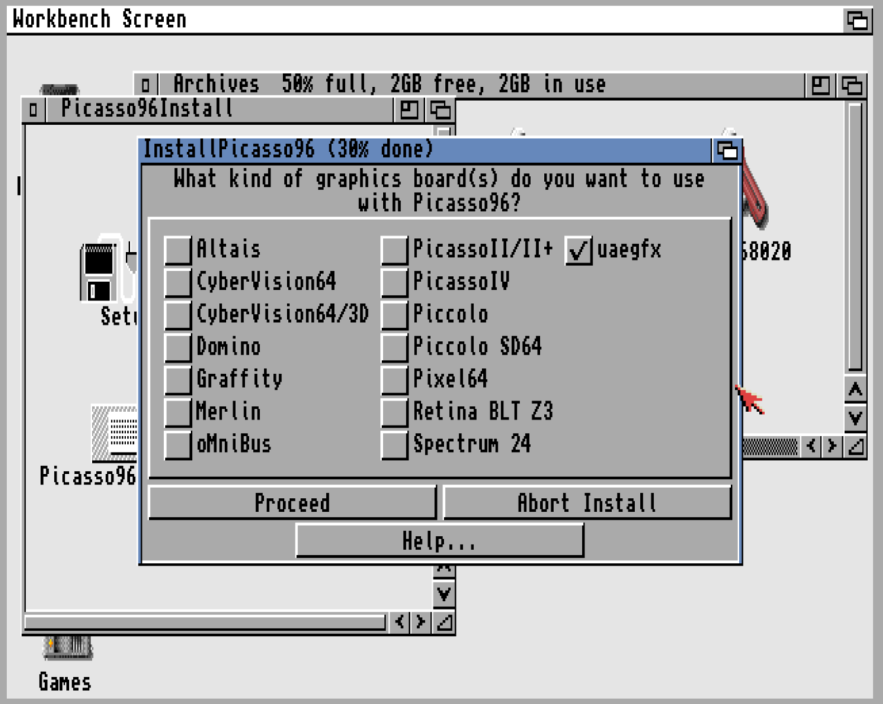 We’ll get to the screen where we choose the cards we want to use with with Picasso96. Select the uaegfx option that should be available since that is the card we have installed. Click Proceed to continue.