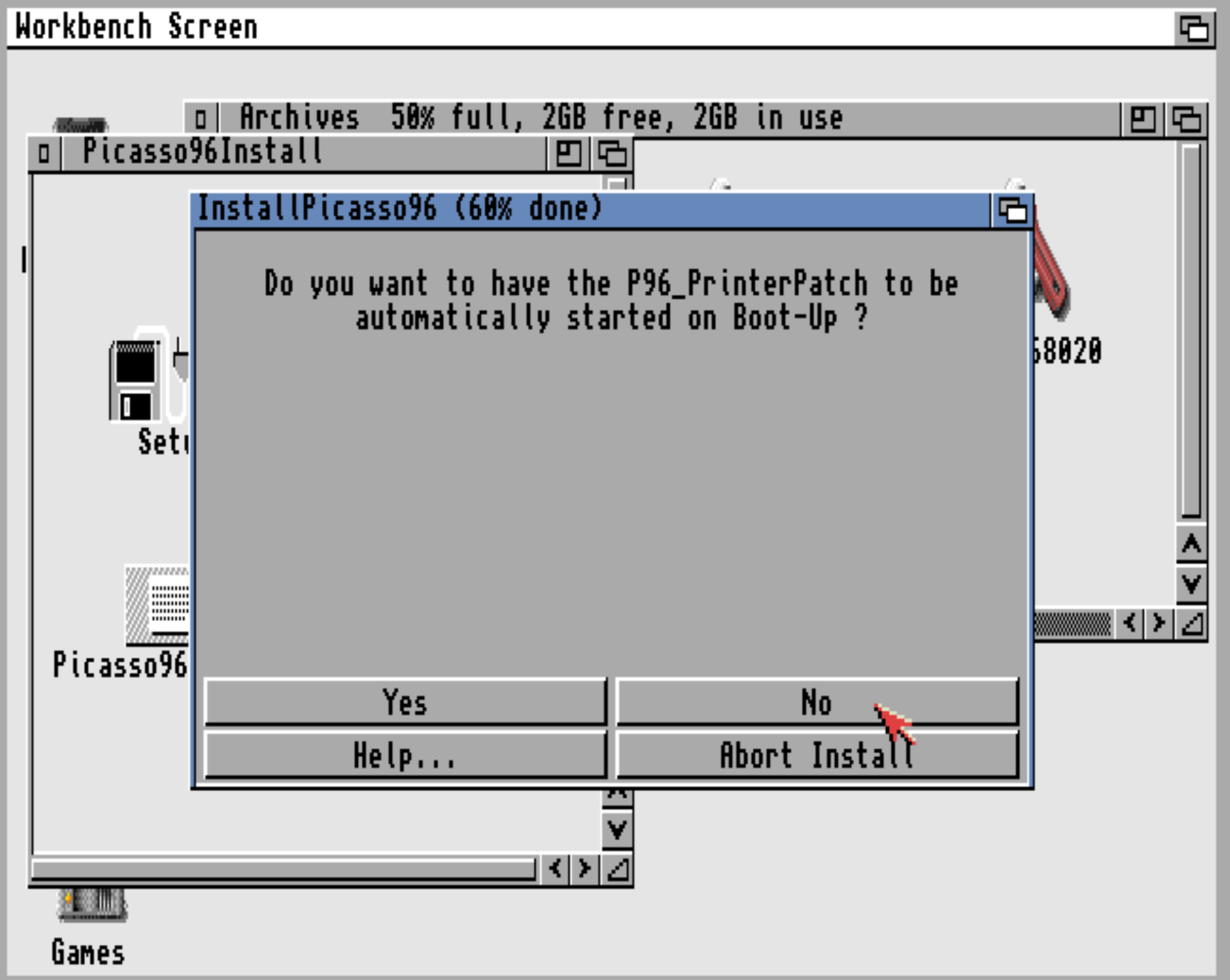 Nearly done! We get asked if we want to install the P96_PrinterPatch. I have found this seems to cause annoying popups during the OS startup and since I don’t intend to use a printer, I choose No here