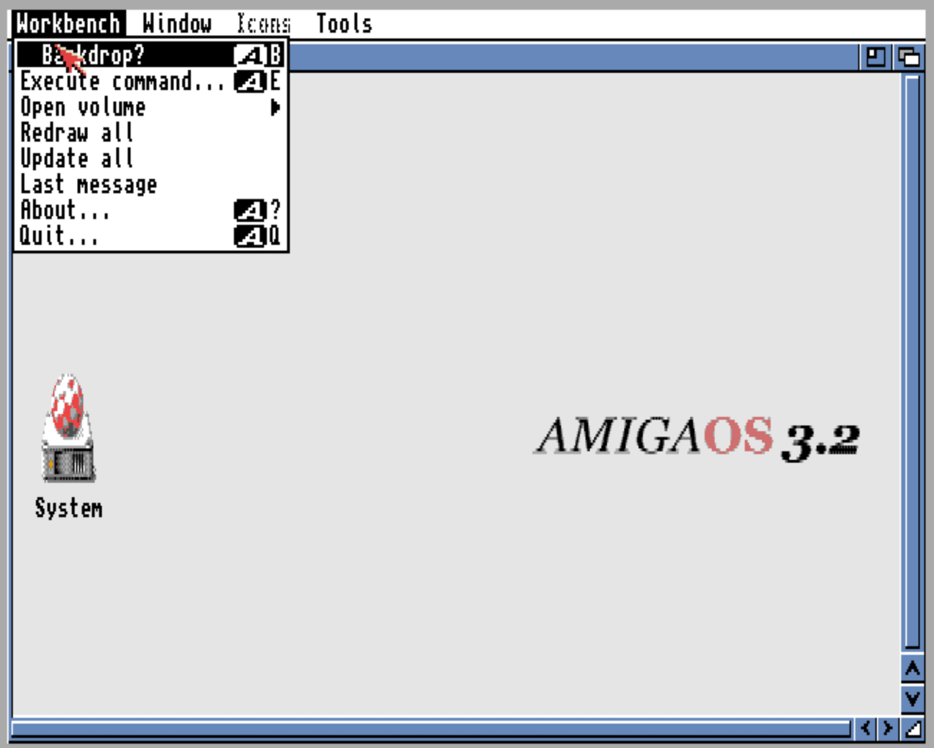 Before we do anything else, lets remove the Workbench window border. I feel the Amiga looks cleaner without it. Hold the Right Mouse Button down and navigate to the Workbench menu. Then select the Backdrop Item and this will make the window border go away.