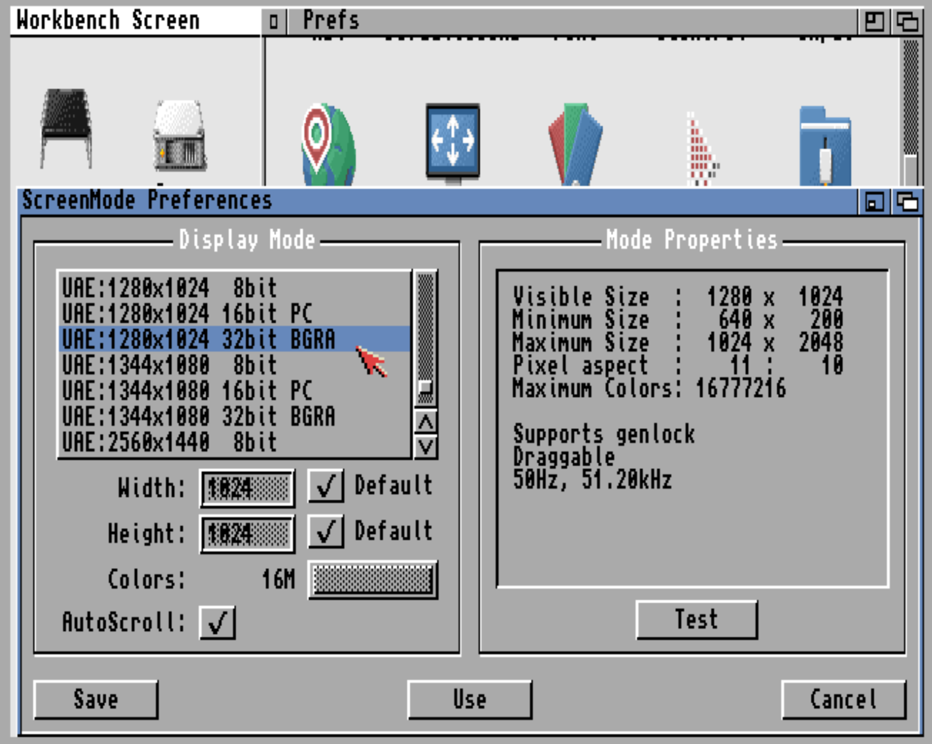 Helpfully, UAE injects a set of new screen modes into the emulator for us so we don’t need to use the Picasso96 tools to create them as we would on a real Amiga.