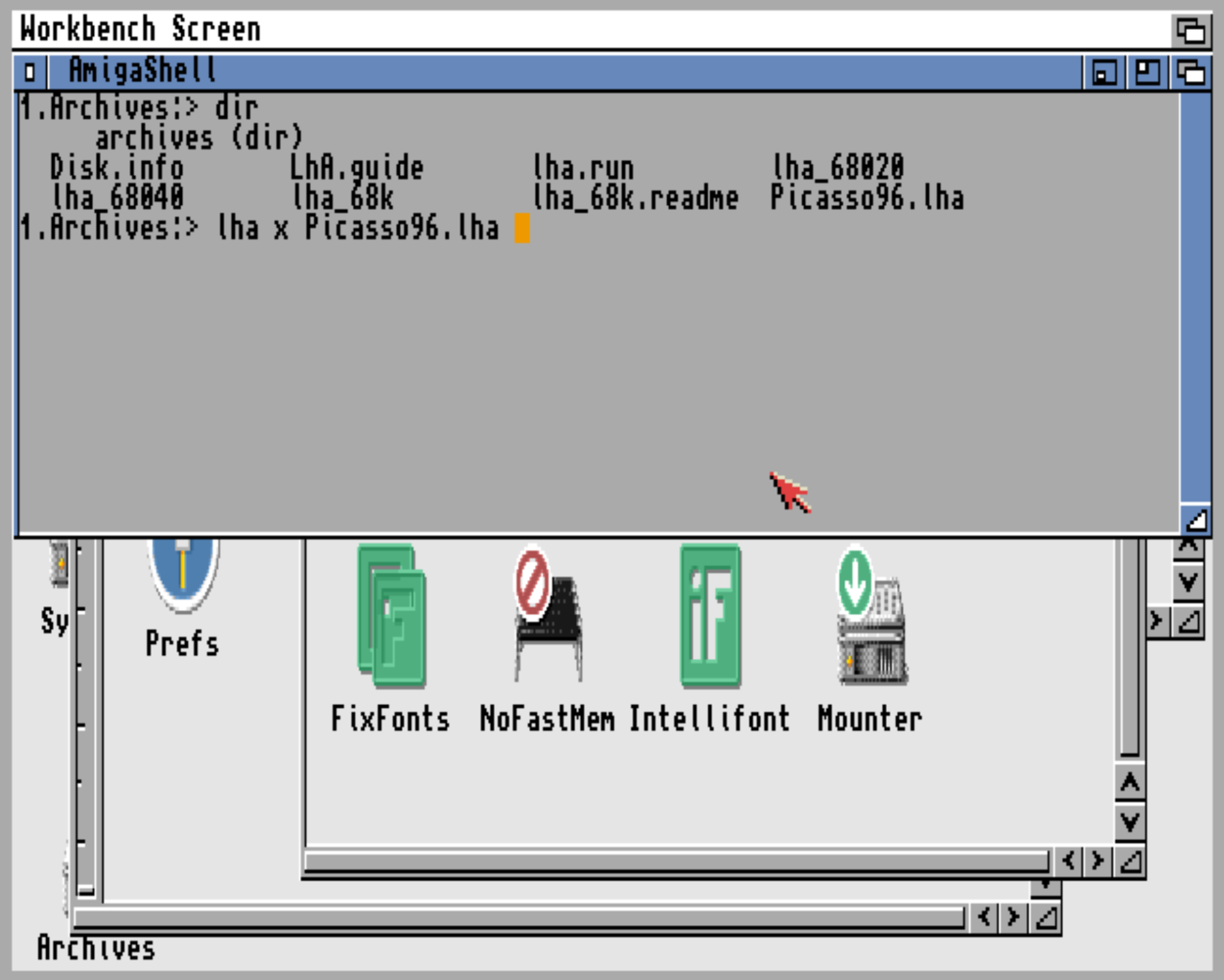 Now we can extract the Picasso96 archive. To do this issue the command: lha x Picasso96.lha This will extract Picasso96 in the current directory.