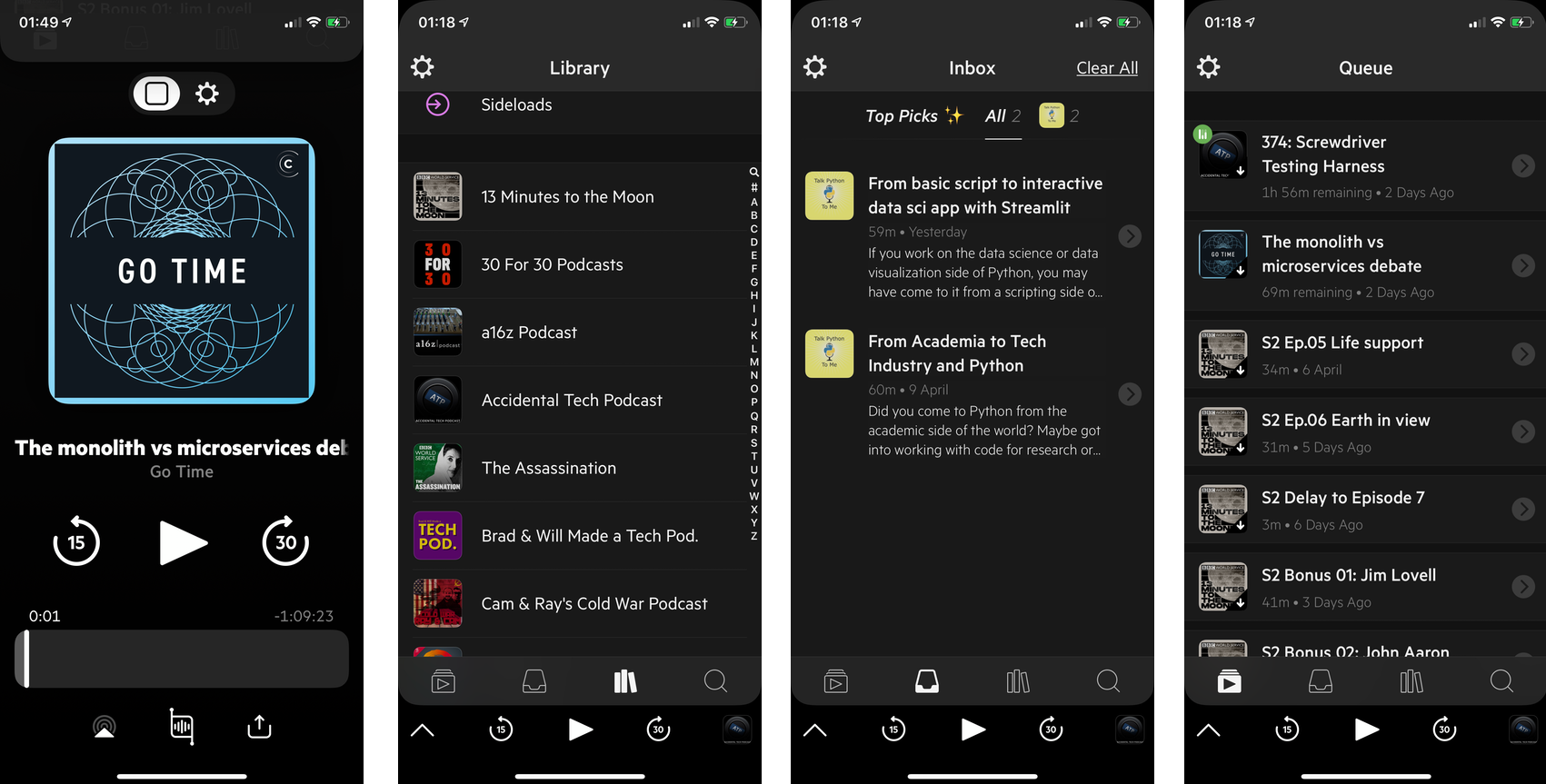 The screenshots above show the Castro Currently Playing view, the Library View, the Inbox view and the Play Queue view.